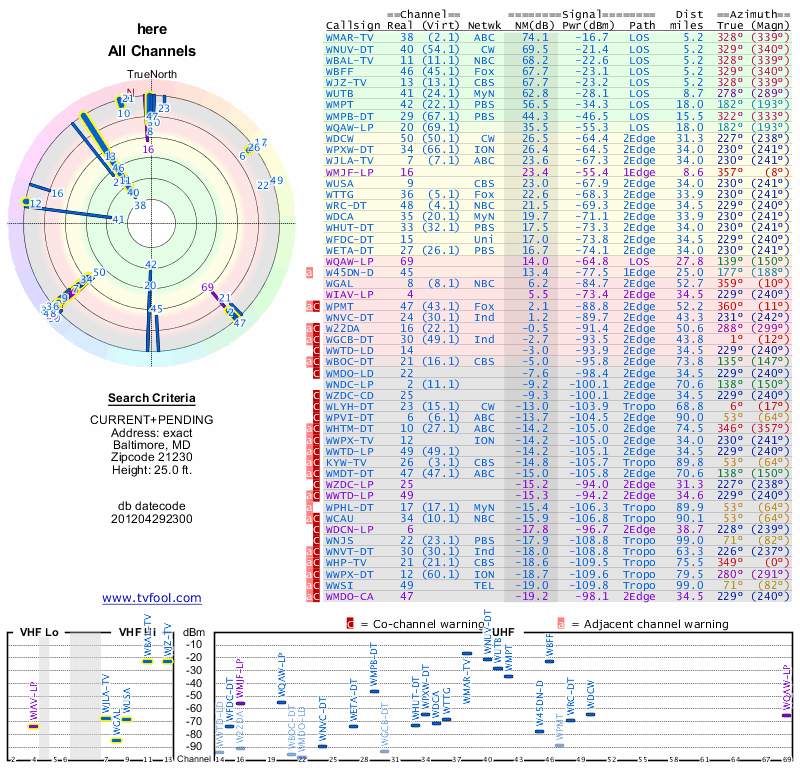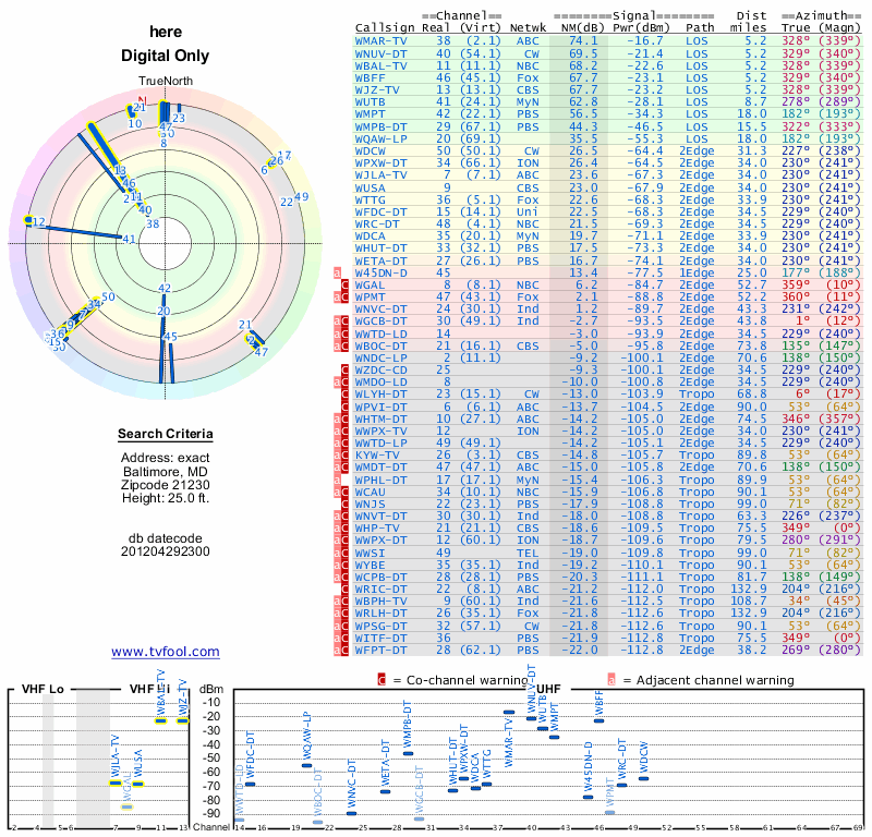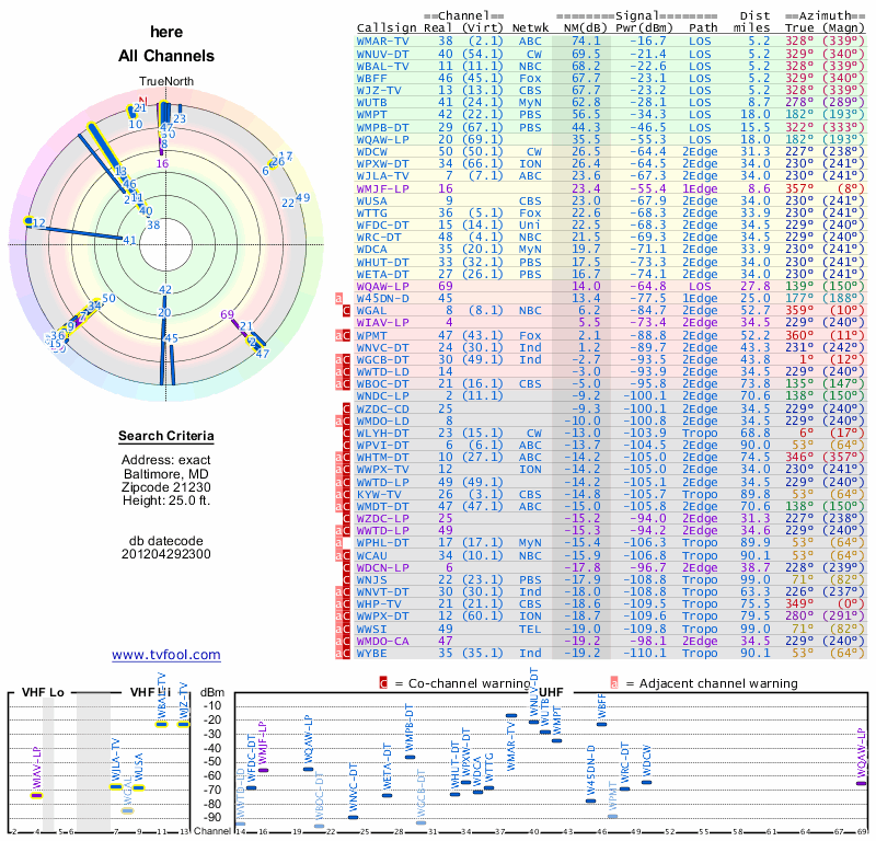 Here are the results for your location. The transmitter database was last updated on June 7, 2013. For more information about these plots and how to interpret them, please check out the Signal Analysis FAQ.