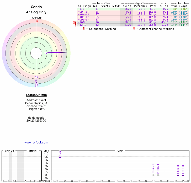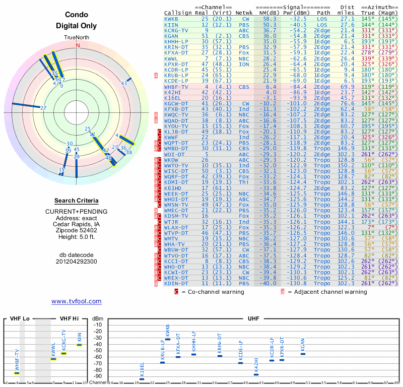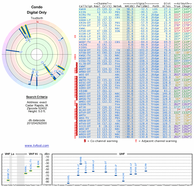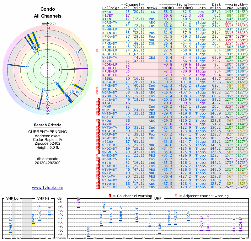Here are the results for your location. The transmitter database was last updated on June 7, 2013. For more information about these plots and how to interpret them, please check out the Signal Analysis FAQ.
