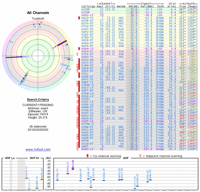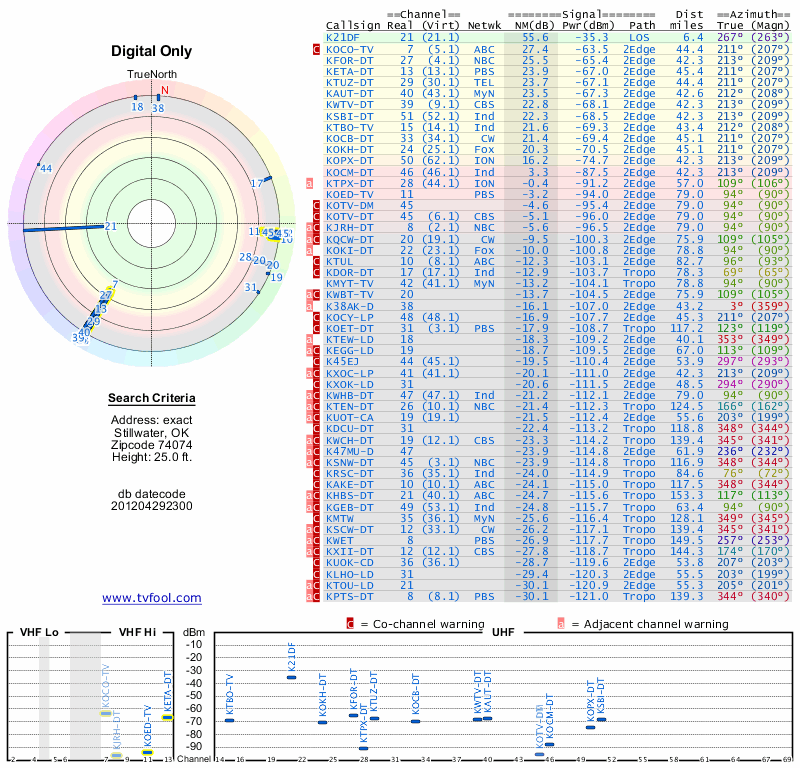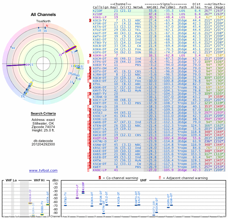 Here are the results for your location. The transmitter database was last updated on June 7, 2013. For more information about these plots and how to interpret them, please check out the Signal Analysis FAQ.