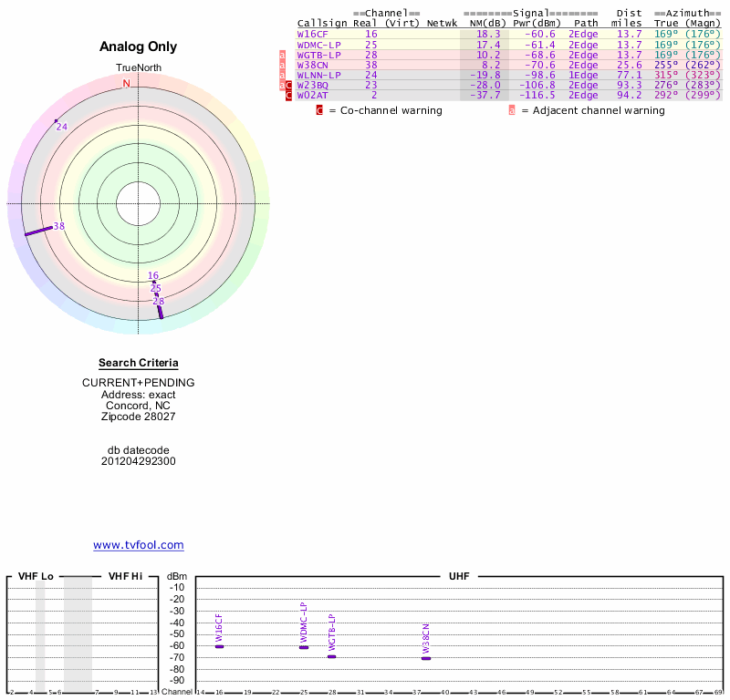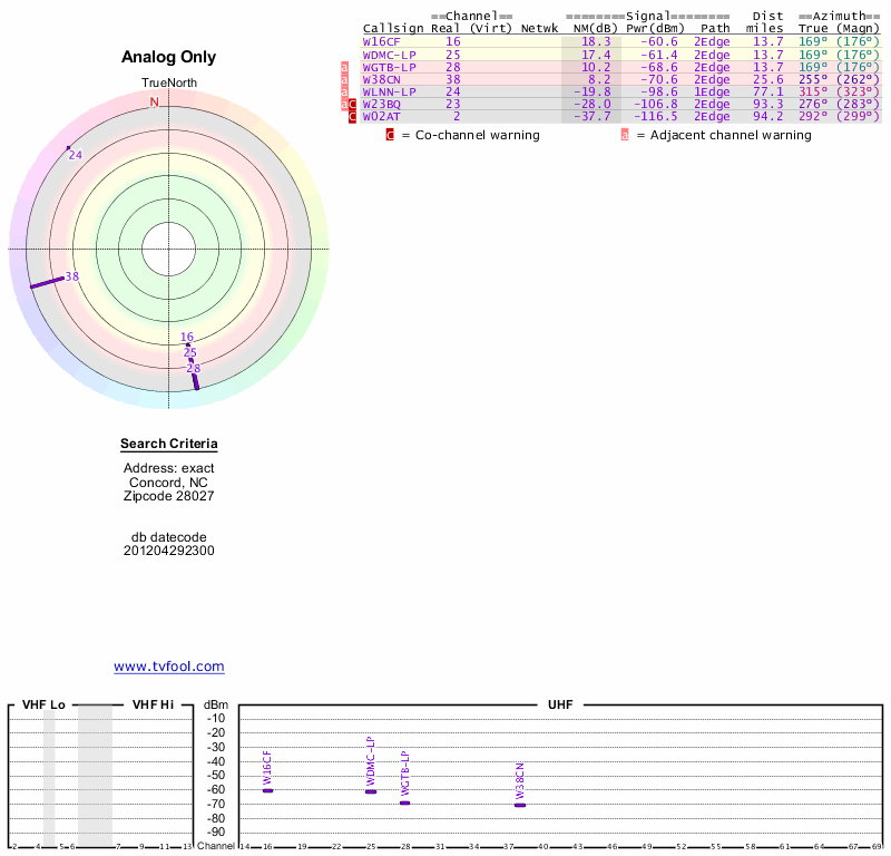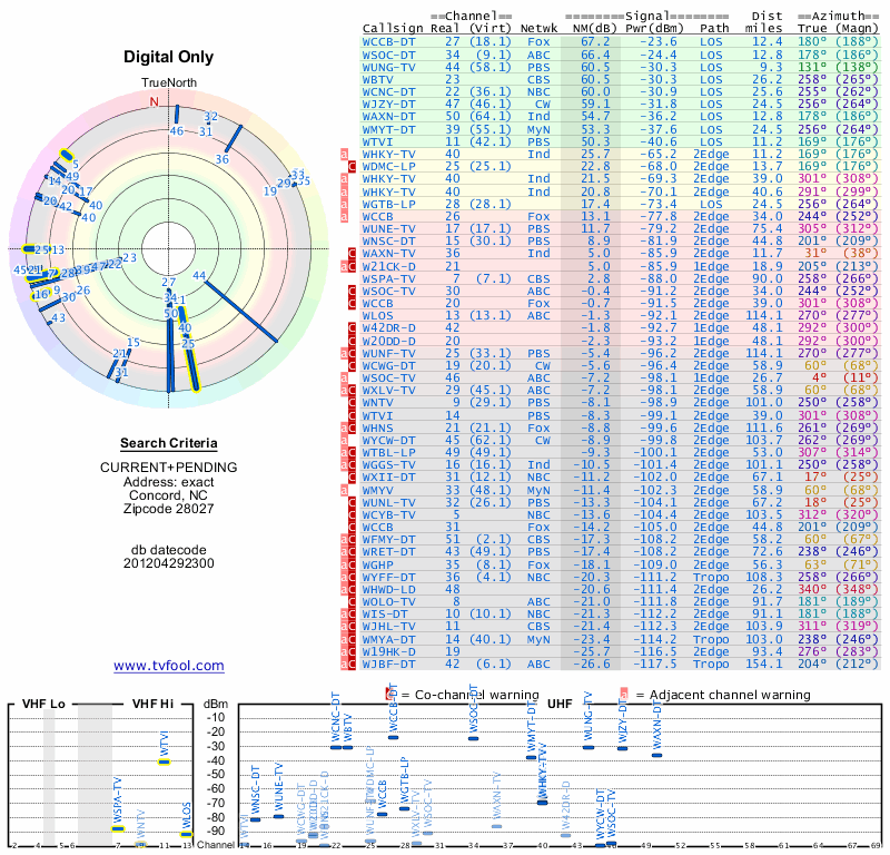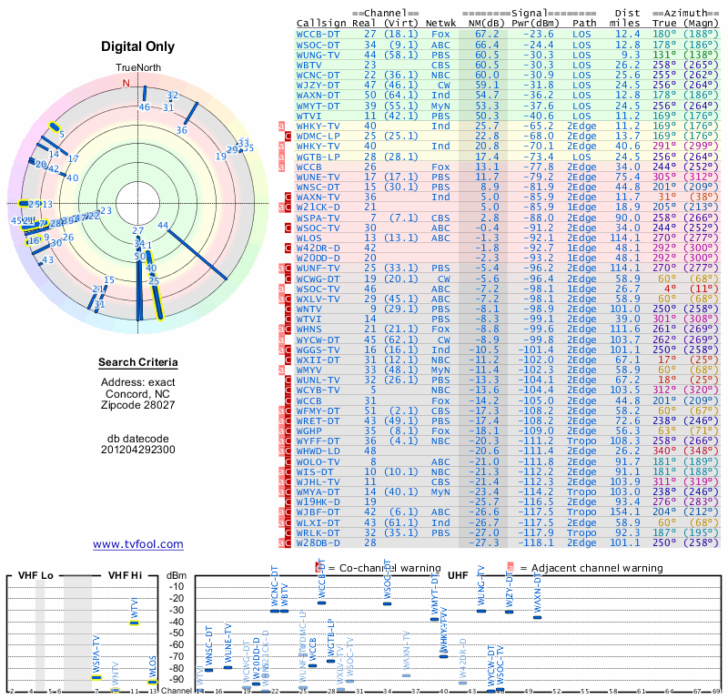 Here are the results for your location. The transmitter database was last updated on June 7, 2013. For more information about these plots and how to interpret them, please check out the Signal Analysis FAQ.
