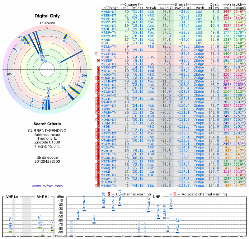 Here are the results for your location. The transmitter database was last updated on June 7, 2013. For more information about these plots and how to interpret them, please check out the Signal Analysis FAQ.