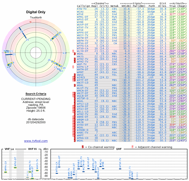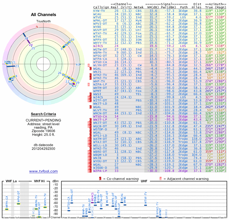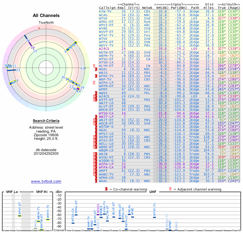 Here are the results for your location. The transmitter database was last updated on June 7, 2013. For more information about these plots and how to interpret them, please check out the Signal Analysis FAQ.