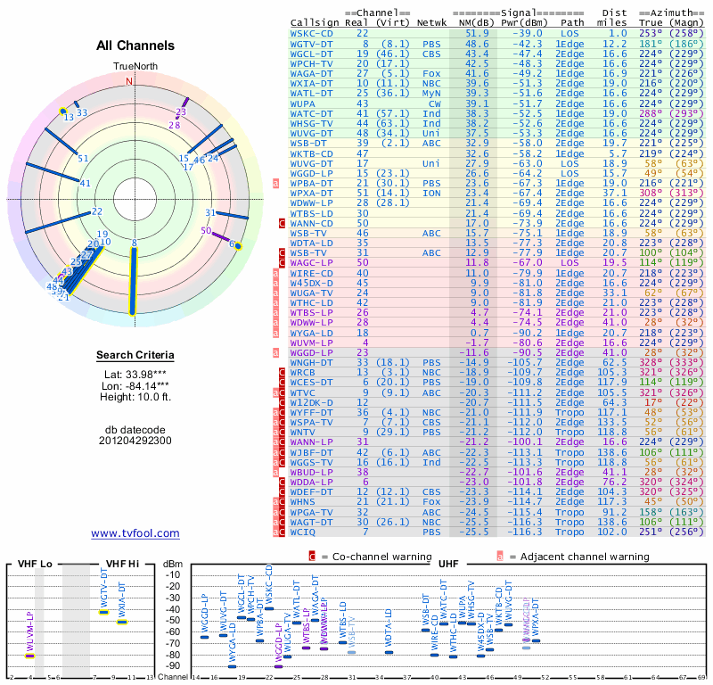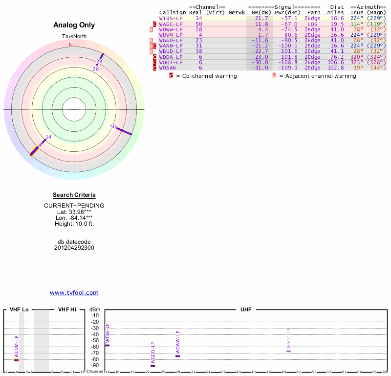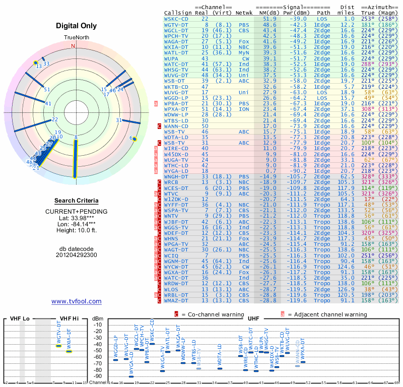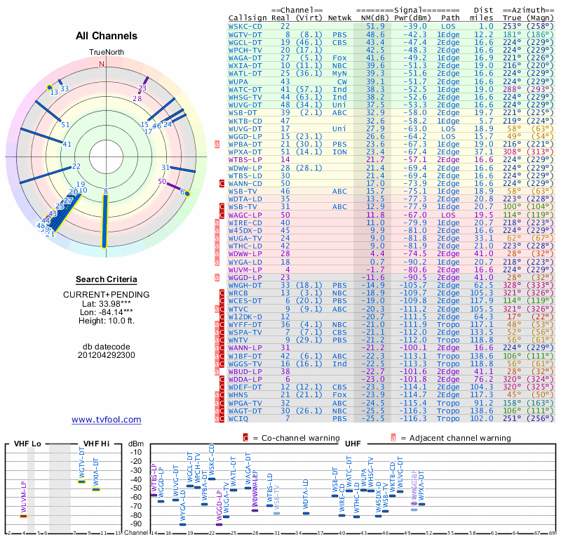 Here are the results for your location. The transmitter database was last updated on June 7, 2013. For more information about these plots and how to interpret them, please check out the Signal Analysis FAQ.