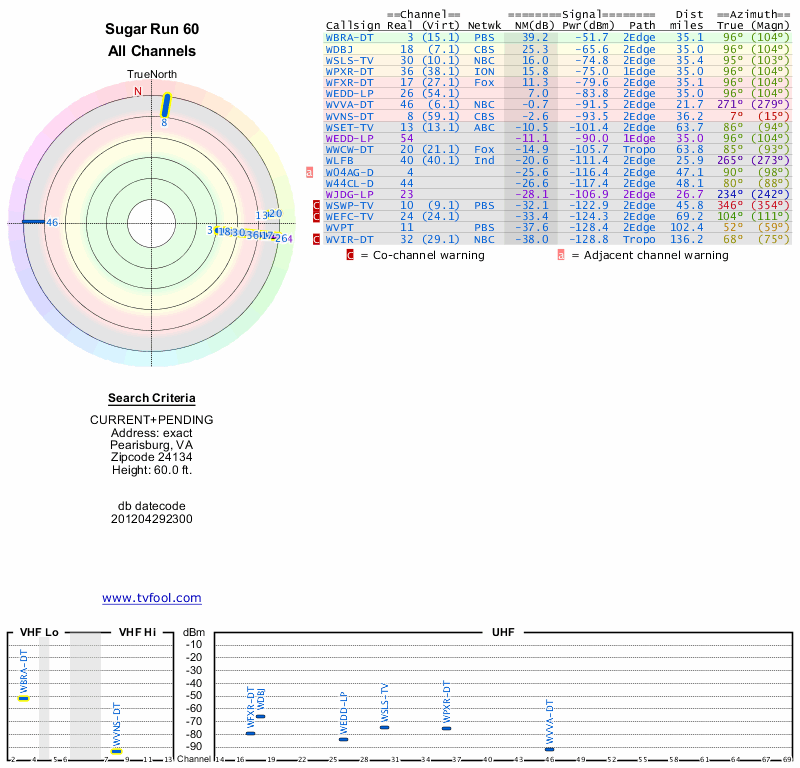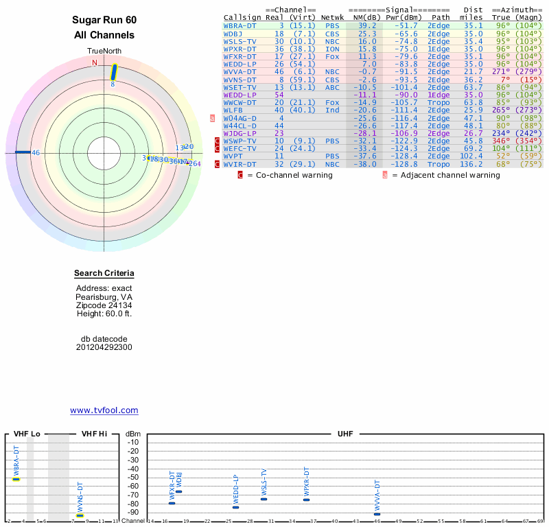 Here are the results for your location. The transmitter database was last updated on June 7, 2013. For more information about these plots and how to interpret them, please check out the Signal Analysis FAQ.