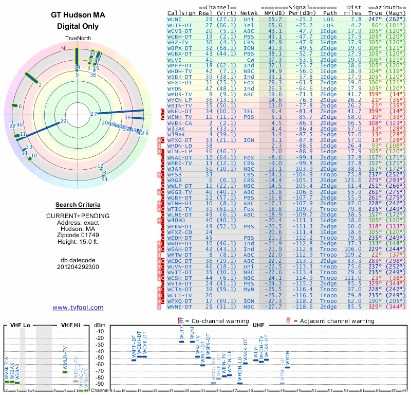 Here are the results for your location. The transmitter database was last updated on June 7, 2013. For more information about these plots and how to interpret them, please check out the Signal Analysis FAQ.