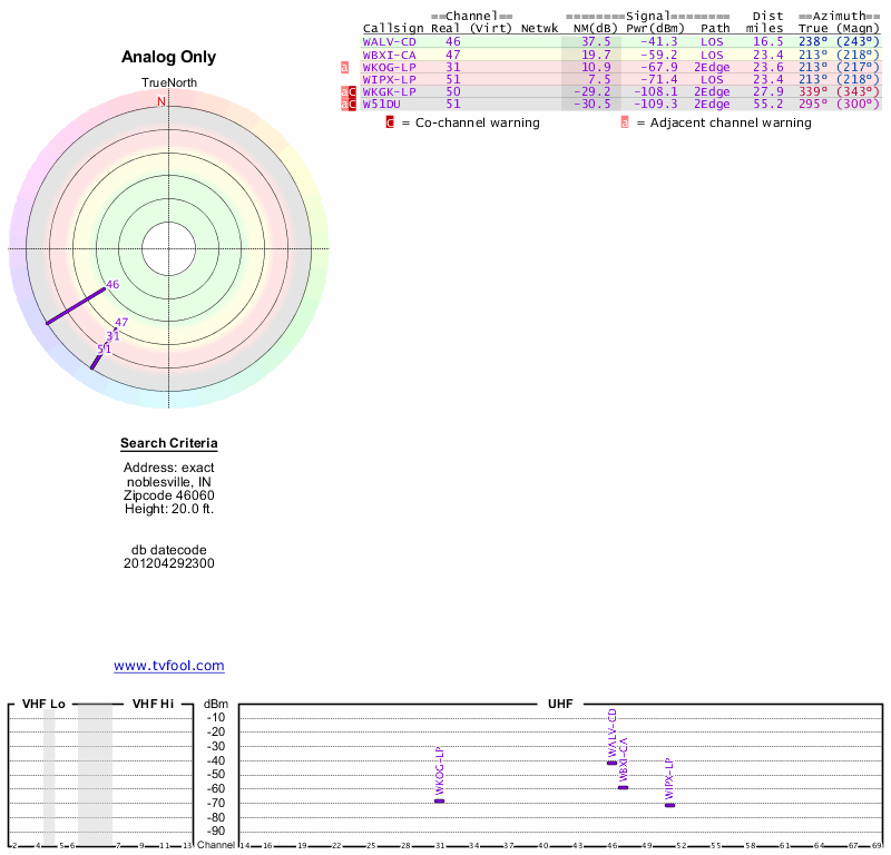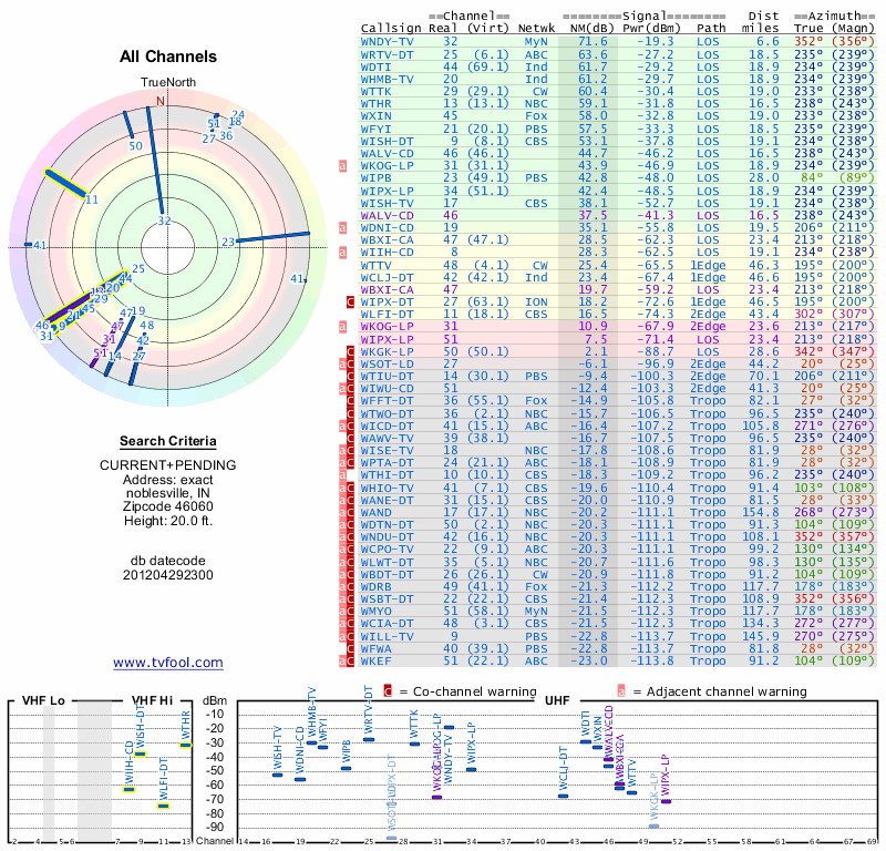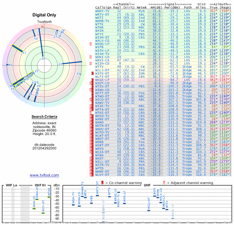 Here are the results for your location. The transmitter database was last updated on June 7, 2013. For more information about these plots and how to interpret them, please check out the Signal Analysis FAQ.