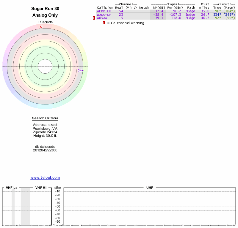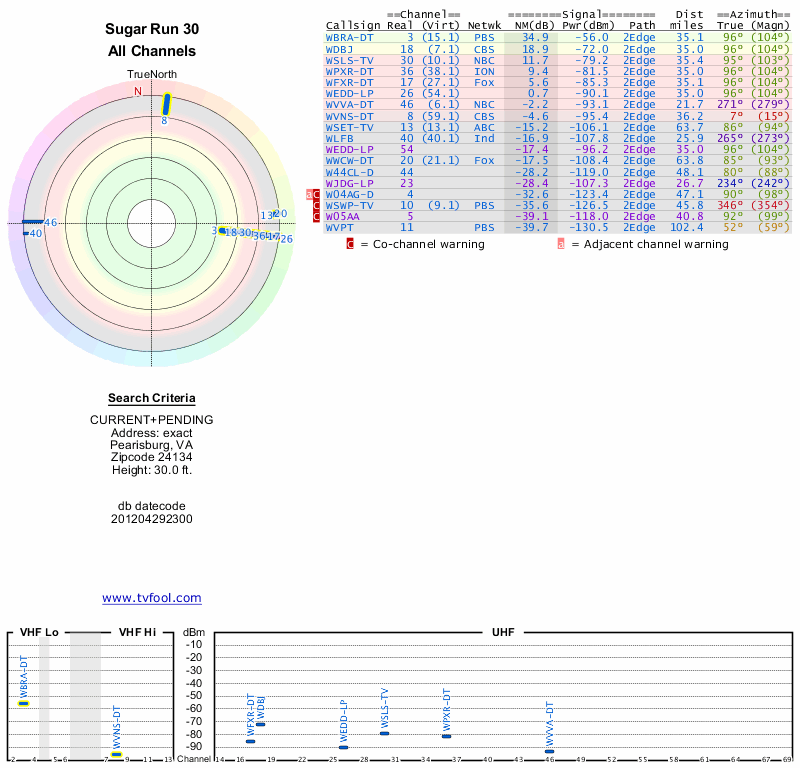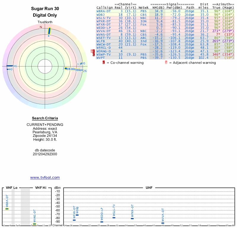 Here are the results for your location. The transmitter database was last updated on June 7, 2013. For more information about these plots and how to interpret them, please check out the Signal Analysis FAQ.
