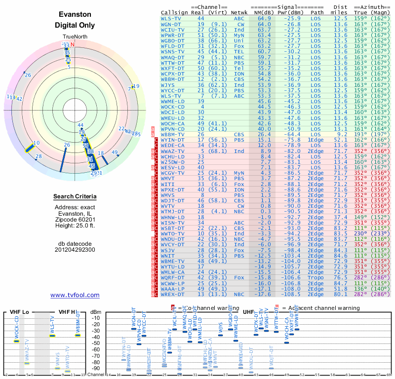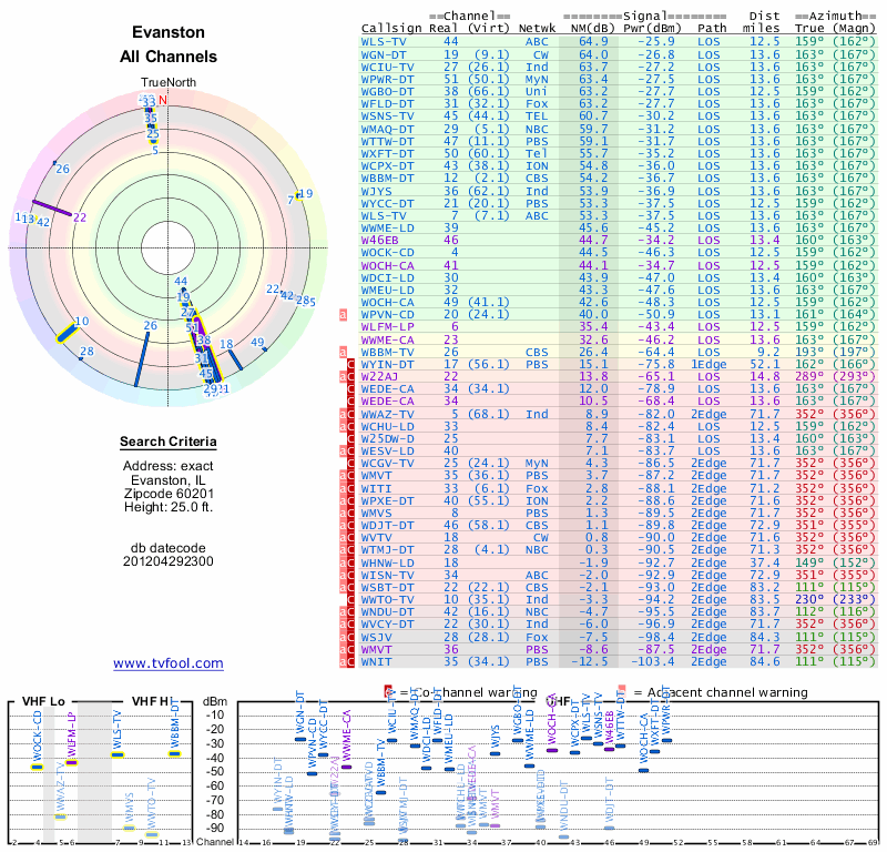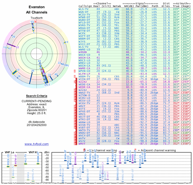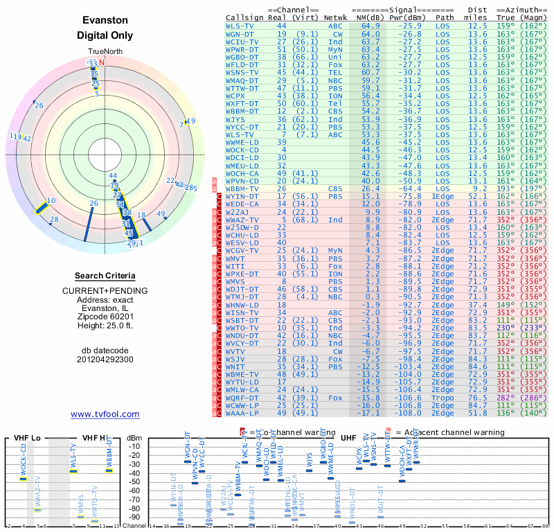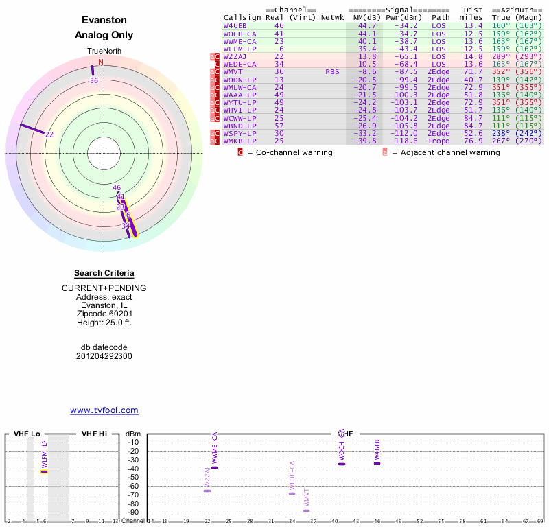 Here are the results for your location. The transmitter database was last updated on June 7, 2013. For more information about these plots and how to interpret them, please check out the Signal Analysis FAQ.