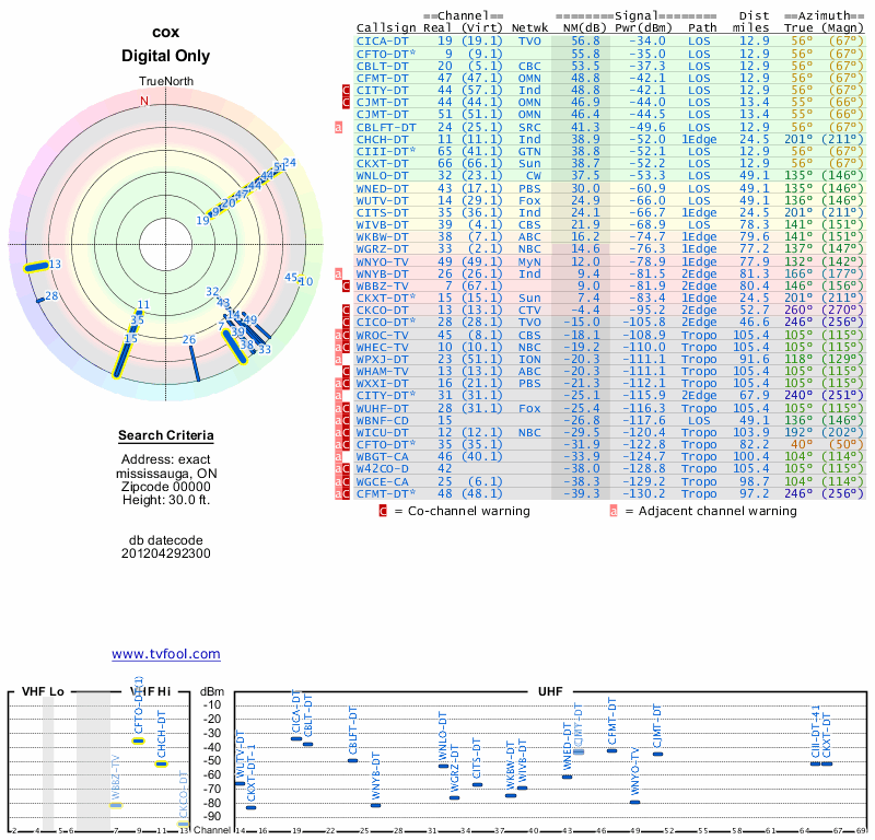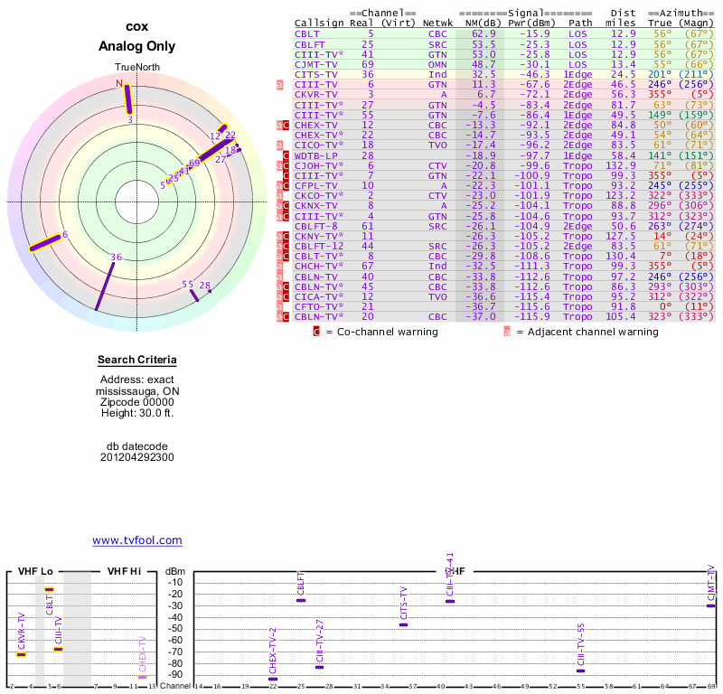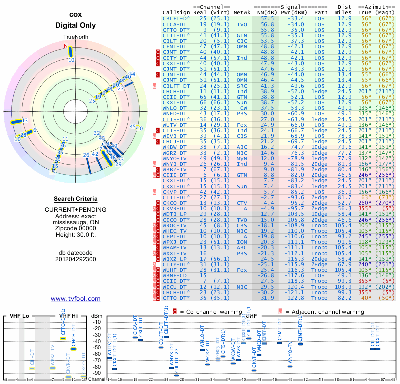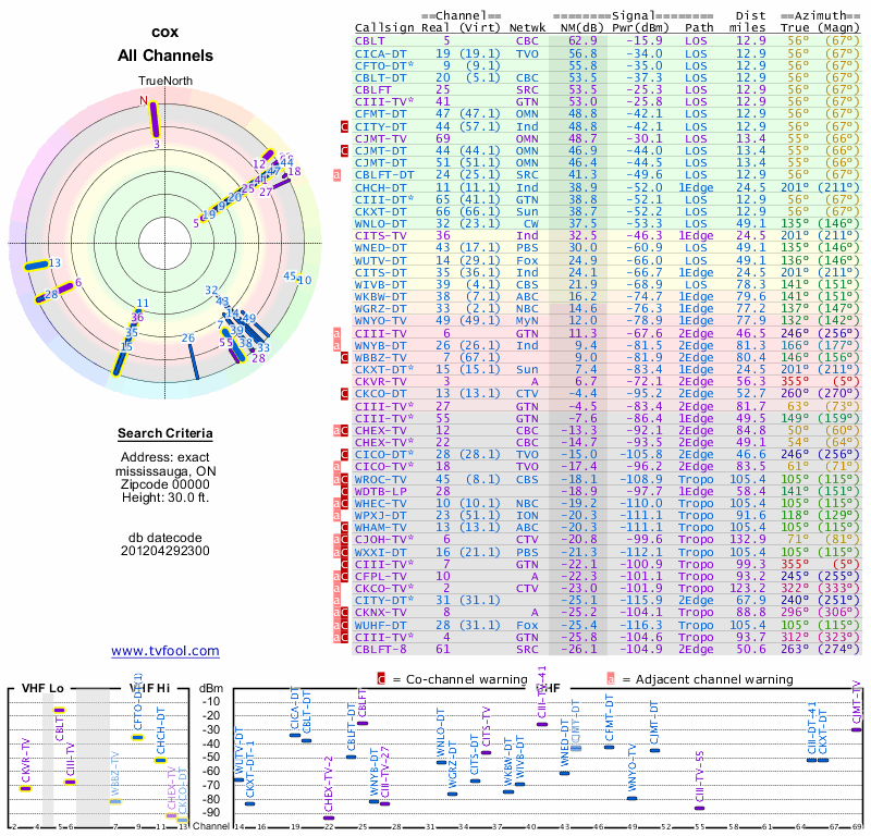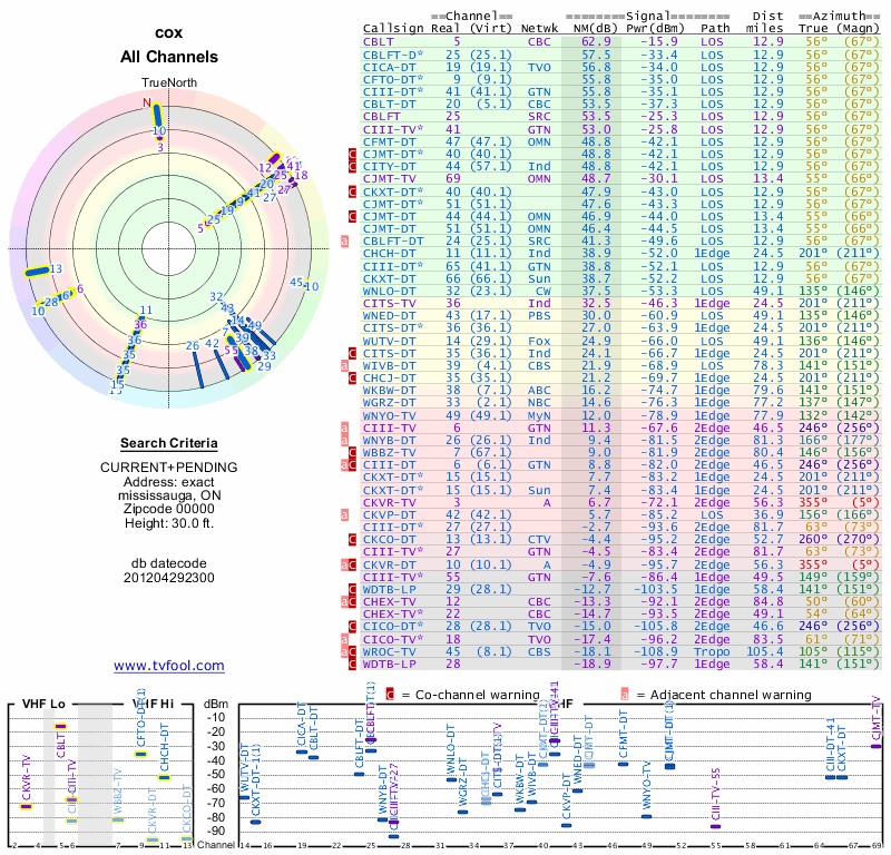 Here are the results for your location. The transmitter database was last updated on June 7, 2013. For more information about these plots and how to interpret them, please check out the Signal Analysis FAQ.