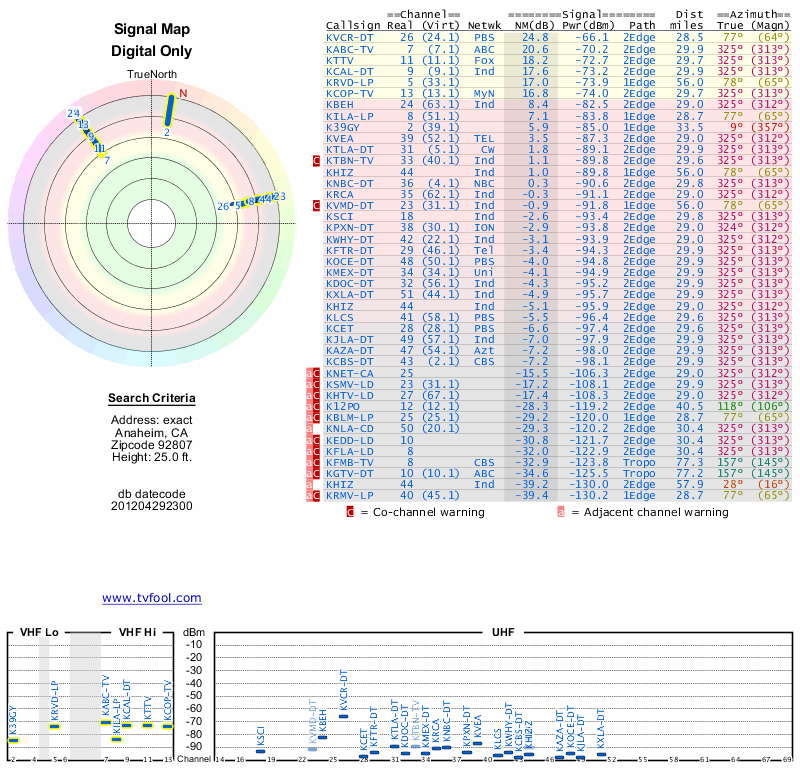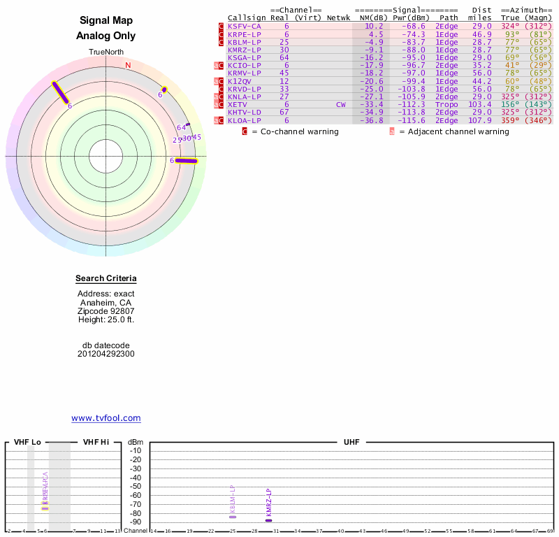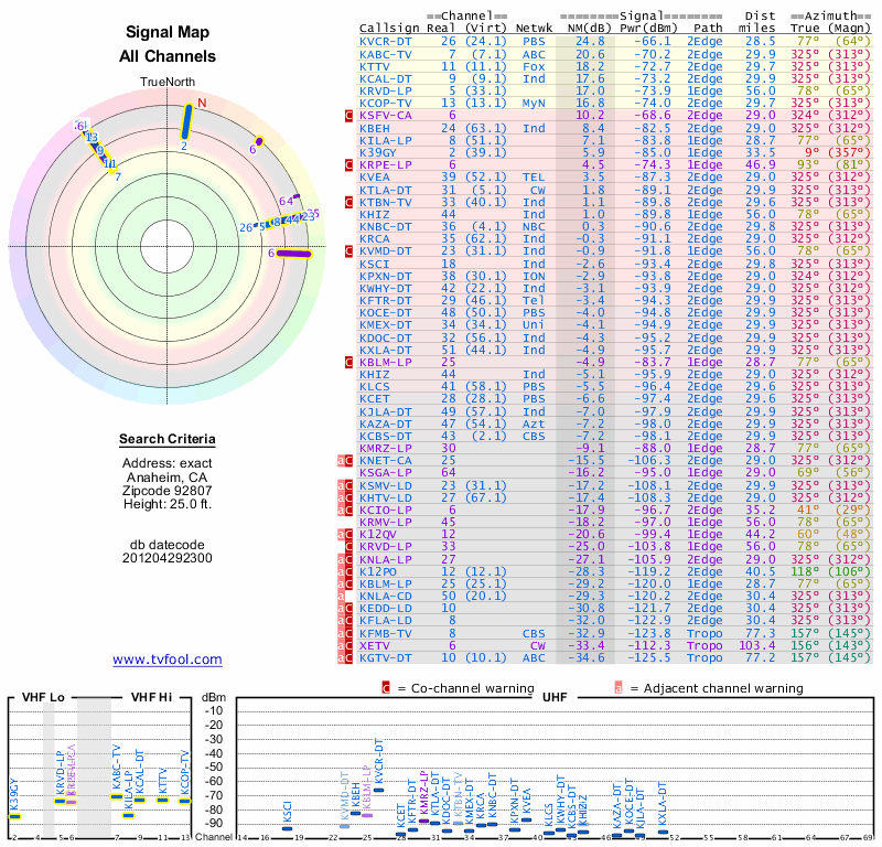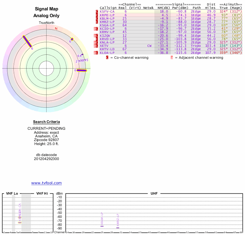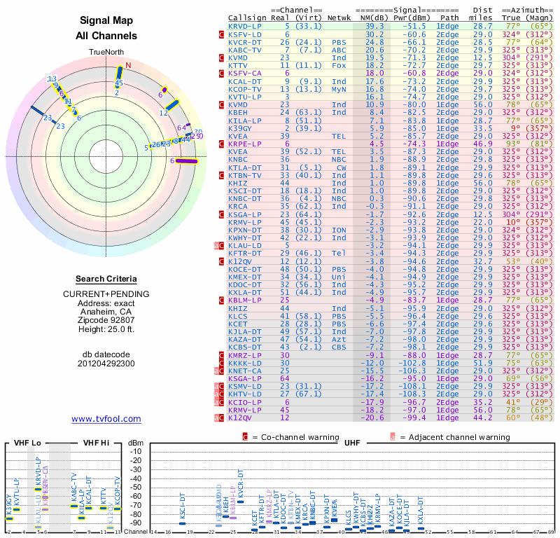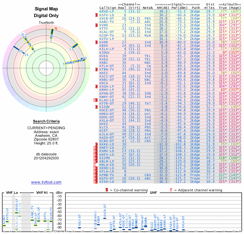 Here are the results for your location. The transmitter database was last updated on June 7, 2013. For more information about these plots and how to interpret them, please check out the Signal Analysis FAQ.