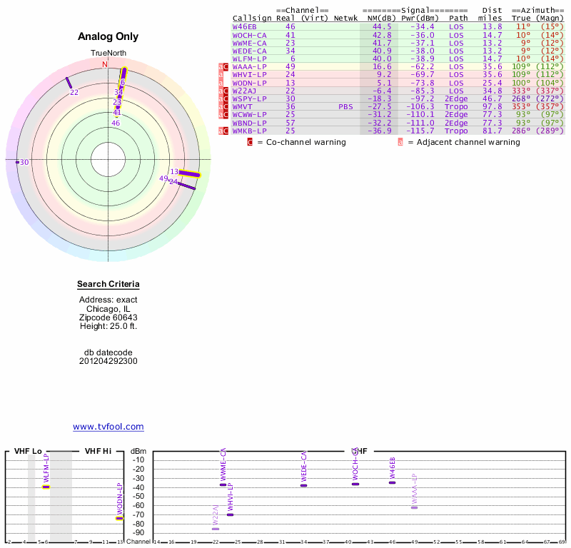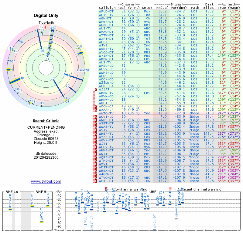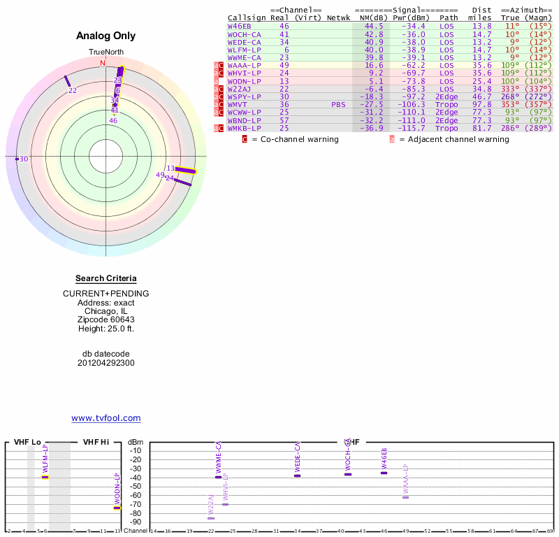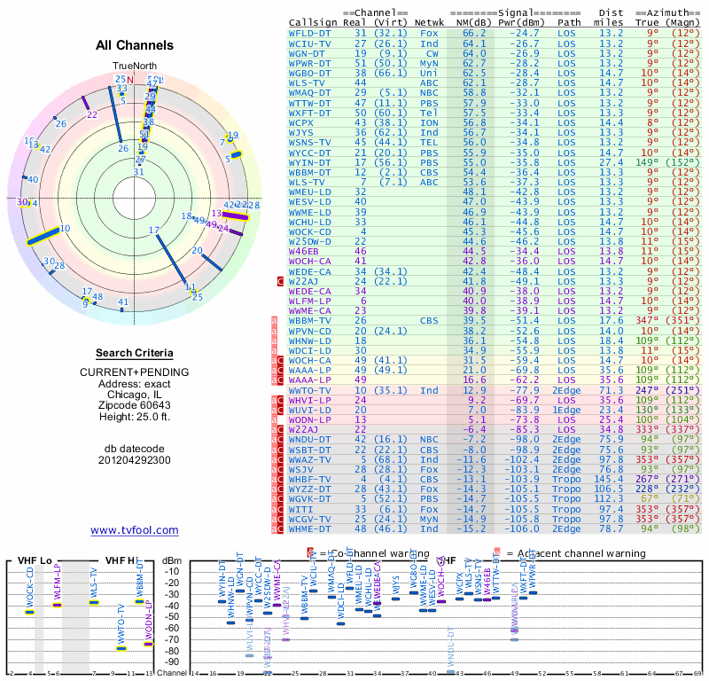 Here are the results for your location. The transmitter database was last updated on June 7, 2013. For more information about these plots and how to interpret them, please check out the Signal Analysis FAQ.