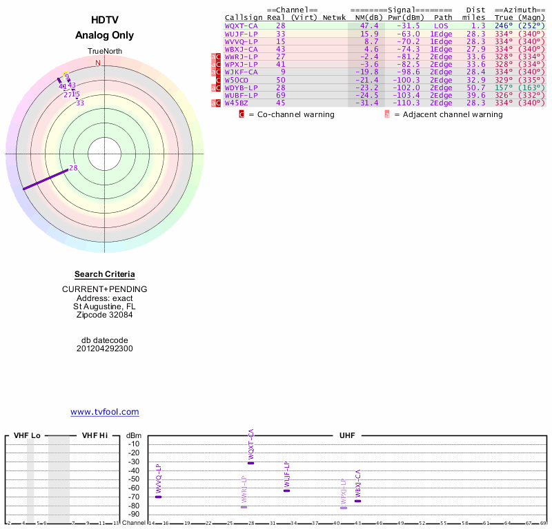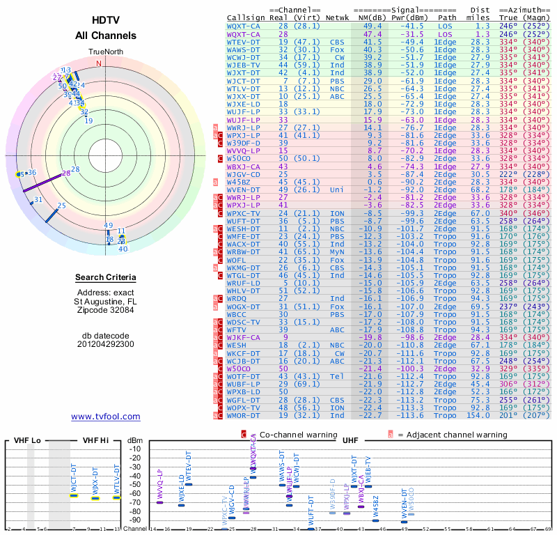 Here are the results for your location. The transmitter database was last updated on June 7, 2013. For more information about these plots and how to interpret them, please check out the Signal Analysis FAQ.