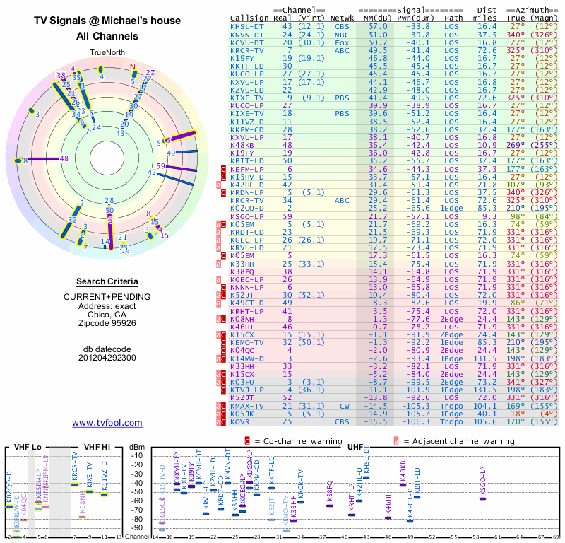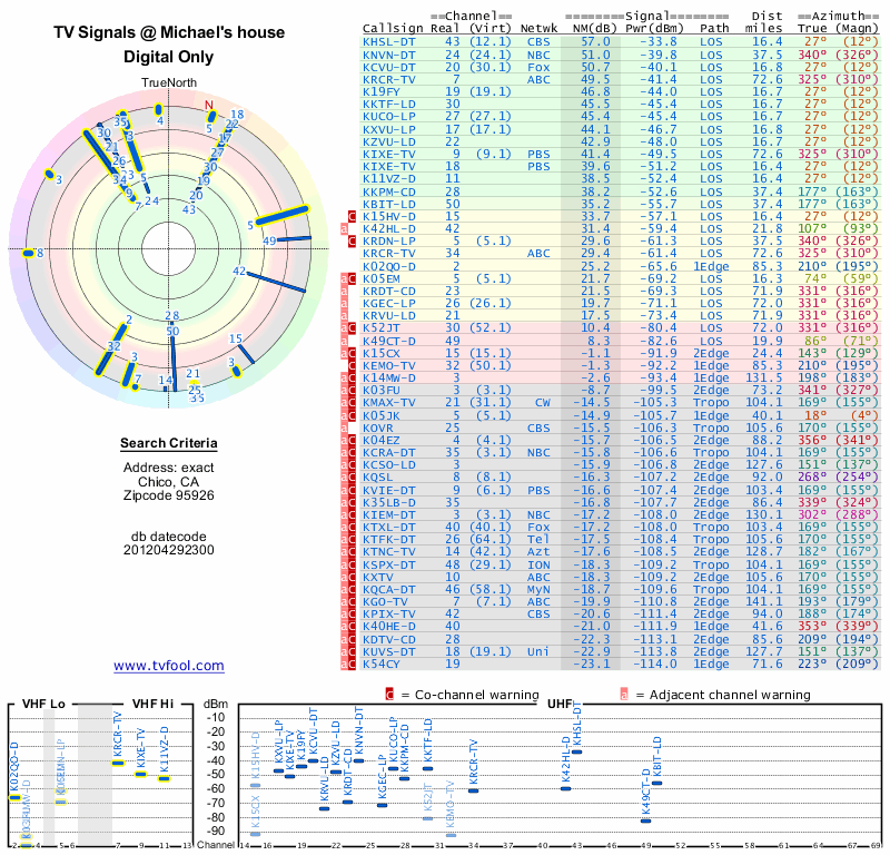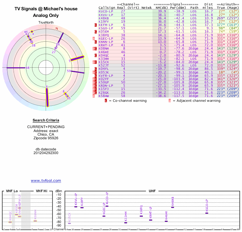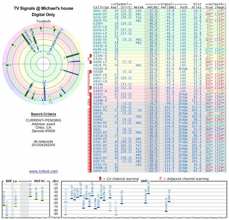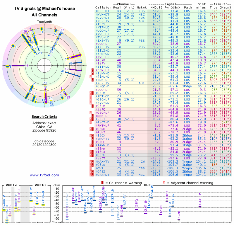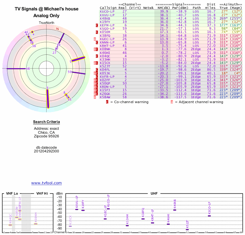 Here are the results for your location. The transmitter database was last updated on June 7, 2013. For more information about these plots and how to interpret them, please check out the Signal Analysis FAQ.