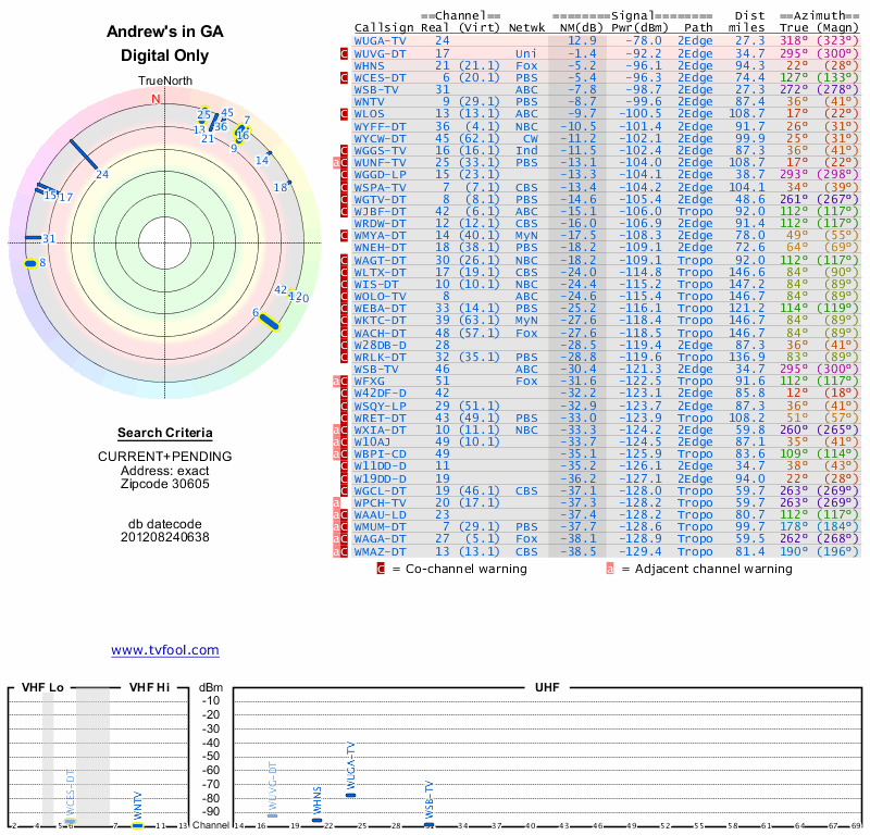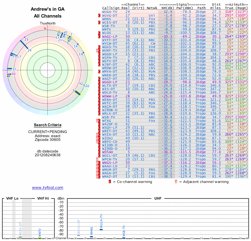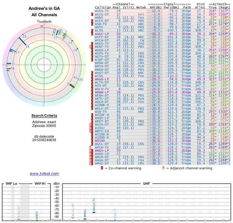 Here are the results for your location. The transmitter database was last updated on June 7, 2013. For more information about these plots and how to interpret them, please check out the Signal Analysis FAQ.