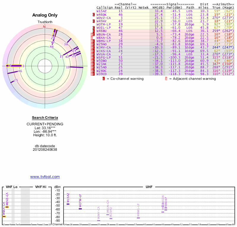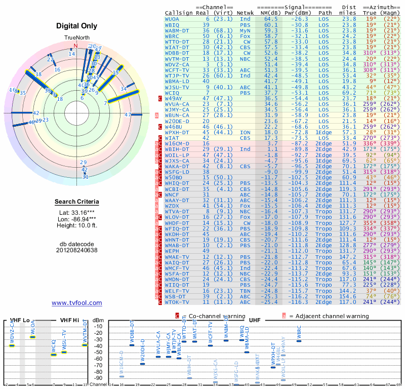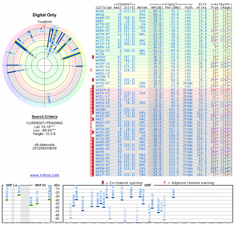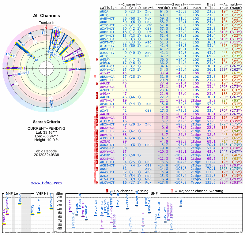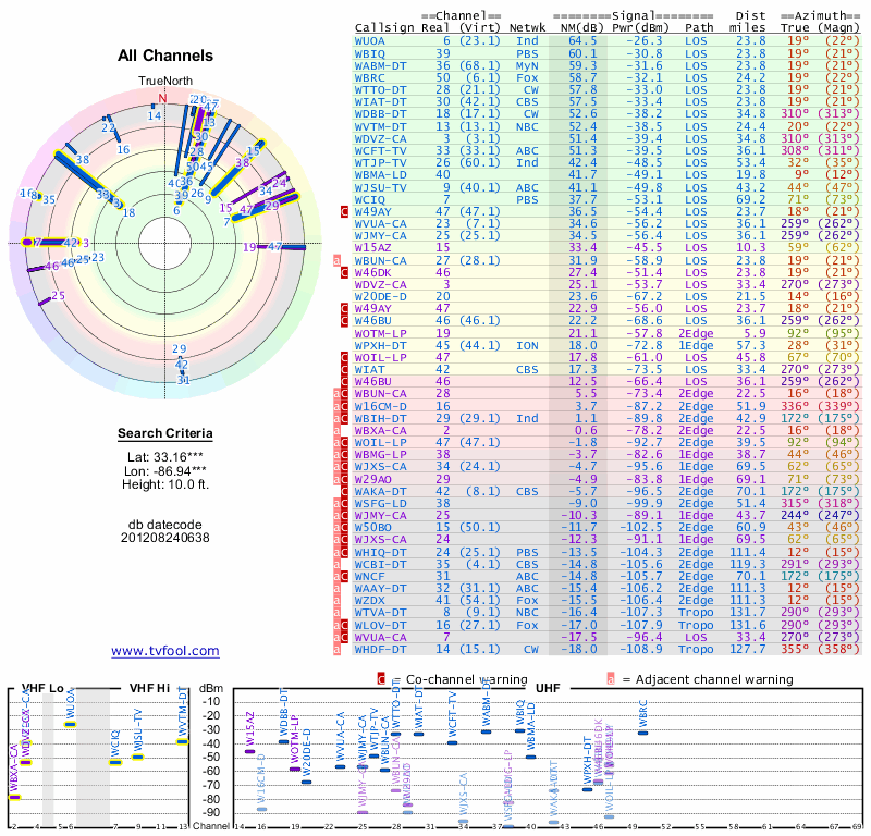 Here are the results for your location. The transmitter database was last updated on June 7, 2013. For more information about these plots and how to interpret them, please check out the Signal Analysis FAQ.