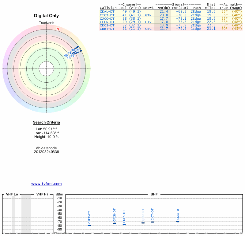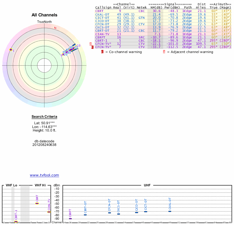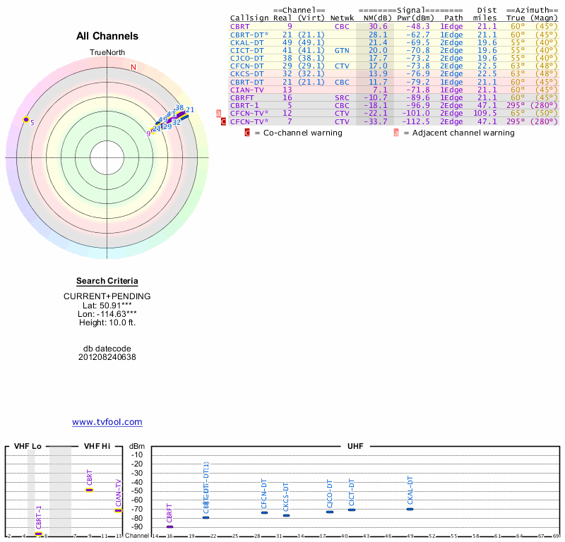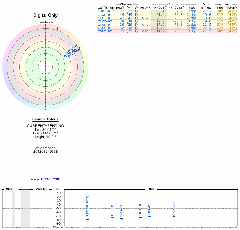 Here are the results for your location. The transmitter database was last updated on June 7, 2013. For more information about these plots and how to interpret them, please check out the Signal Analysis FAQ.