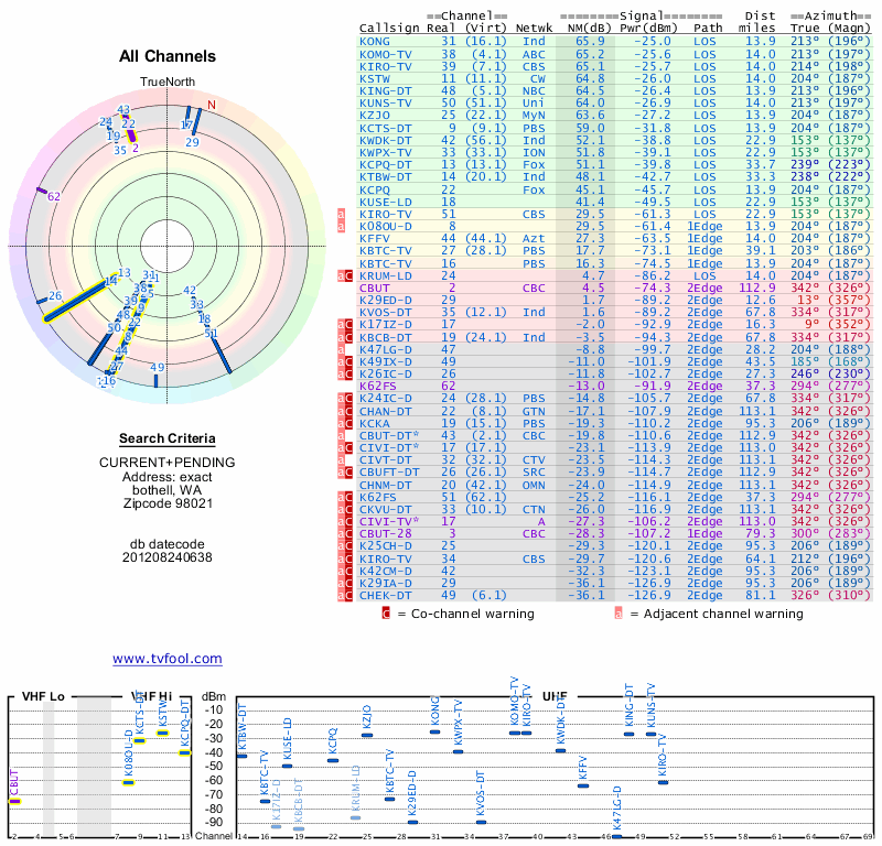 Here are the results for your location. The transmitter database was last updated on June 7, 2013. For more information about these plots and how to interpret them, please check out the Signal Analysis FAQ.
