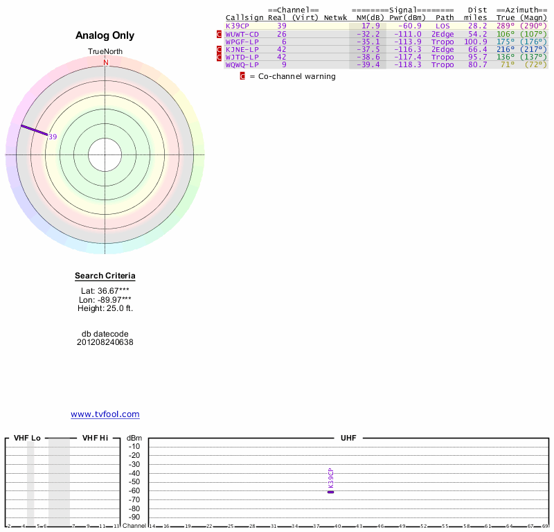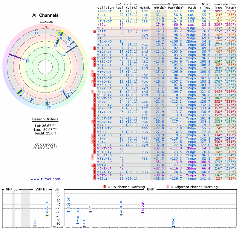 Here are the results for your location. The transmitter database was last updated on June 7, 2013. For more information about these plots and how to interpret them, please check out the Signal Analysis FAQ.