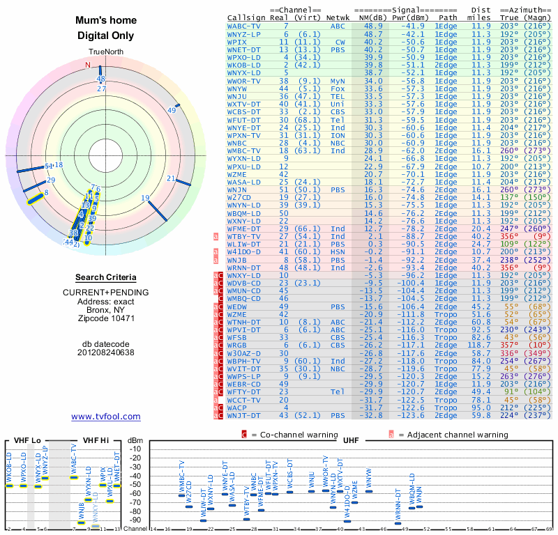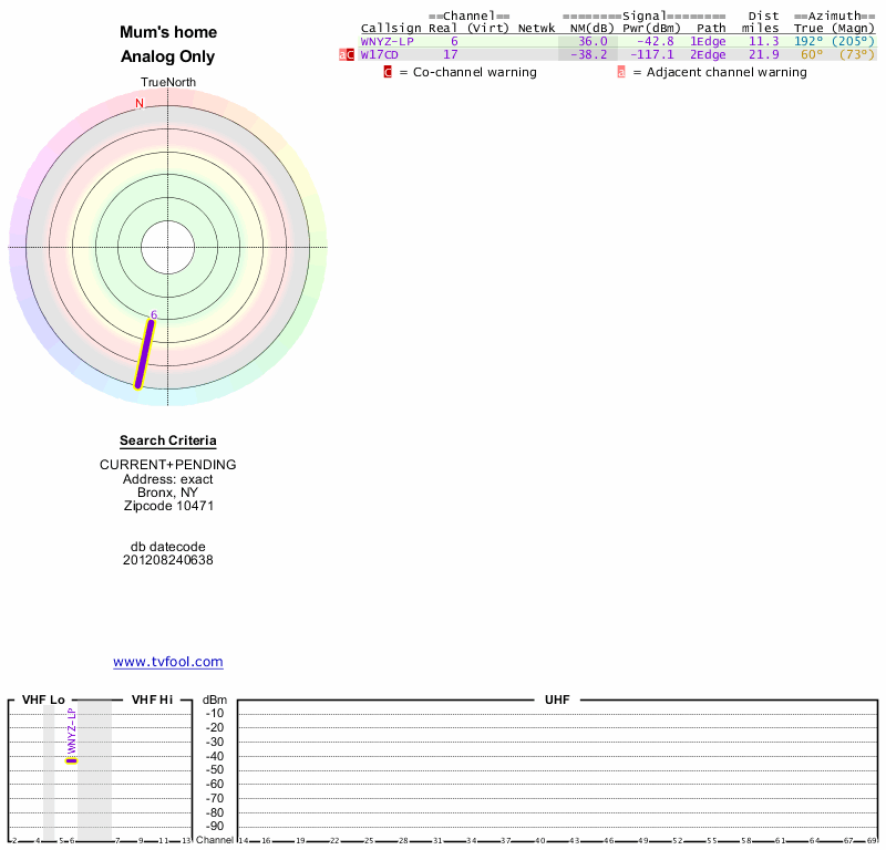Here are the results for your location. The transmitter database was last updated on June 7, 2013. For more information about these plots and how to interpret them, please check out the Signal Analysis FAQ.
