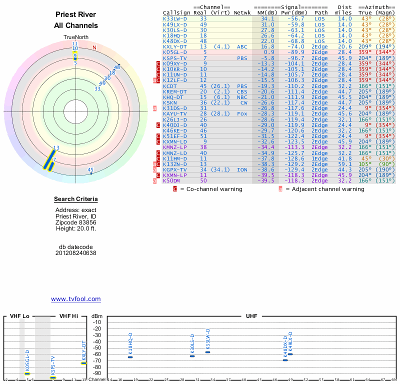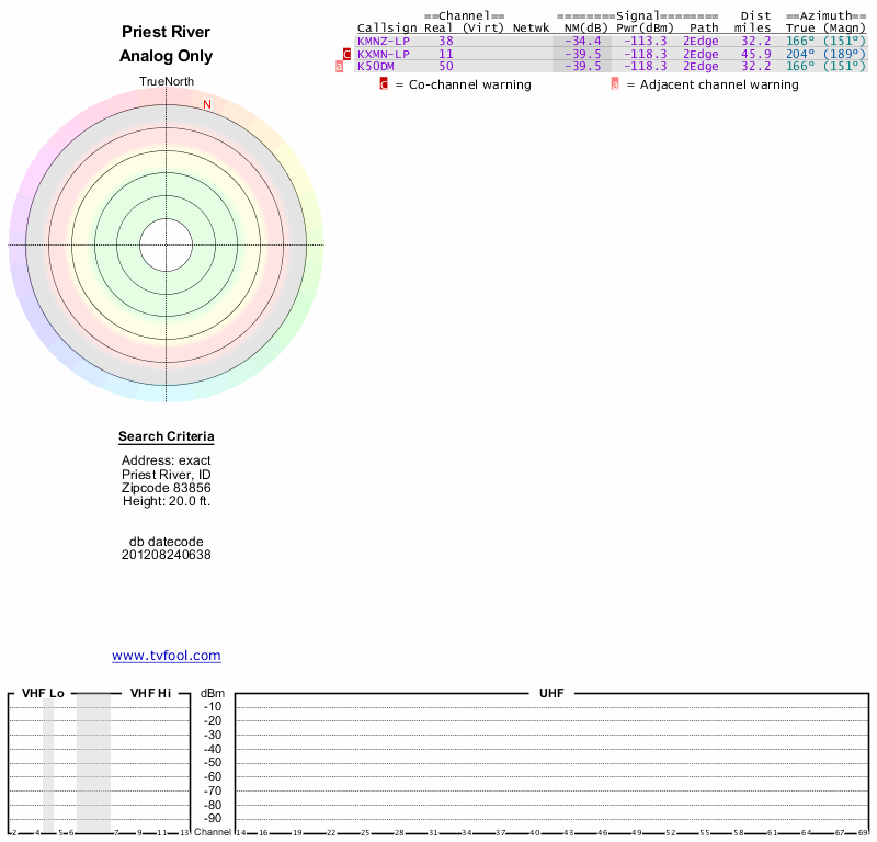 Here are the results for your location. The transmitter database was last updated on June 7, 2013. For more information about these plots and how to interpret them, please check out the Signal Analysis FAQ.