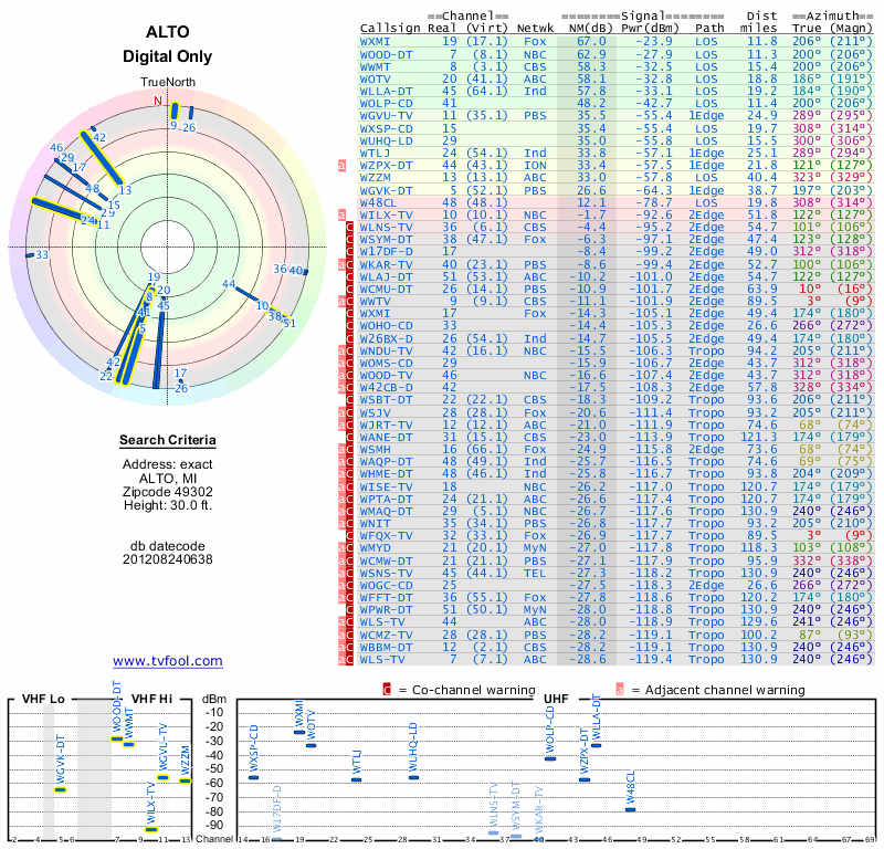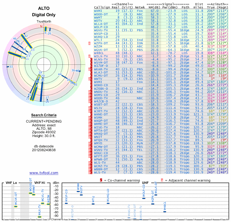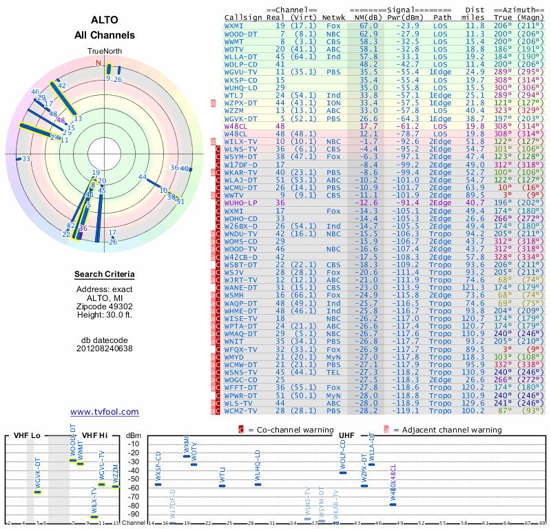 Here are the results for your location. The transmitter database was last updated on June 7, 2013. For more information about these plots and how to interpret them, please check out the Signal Analysis FAQ.