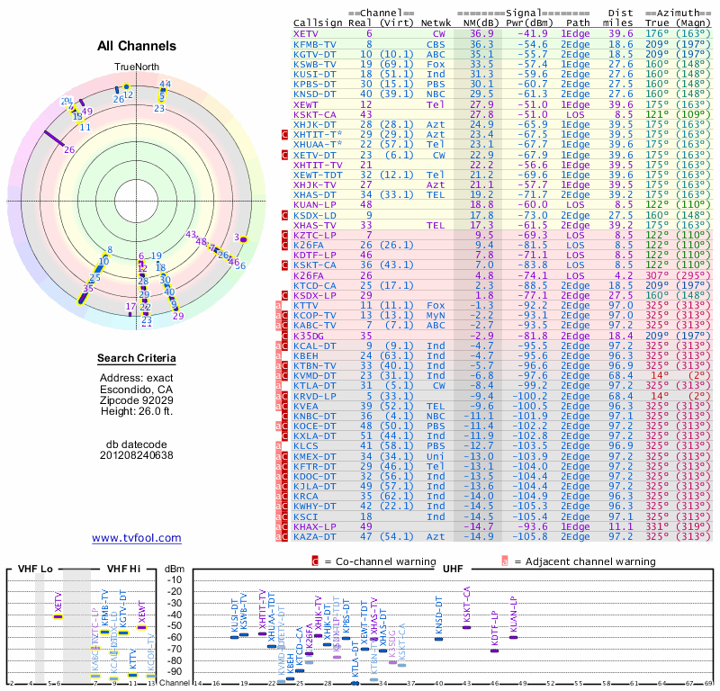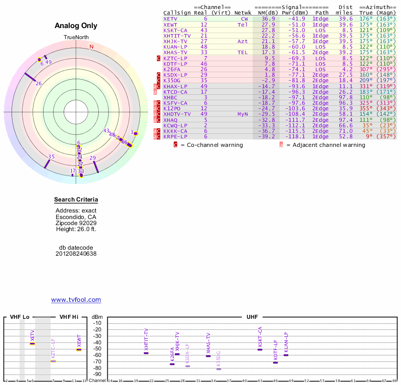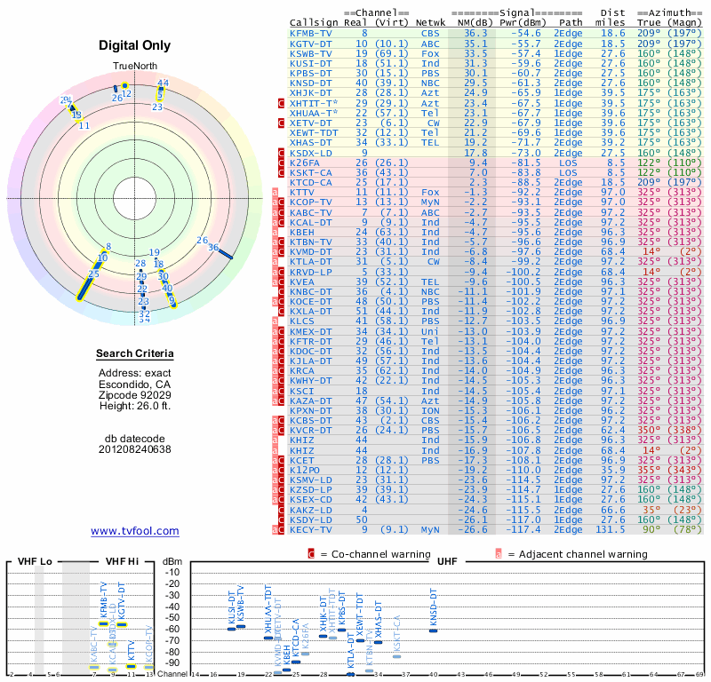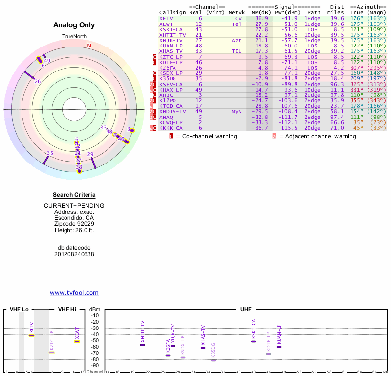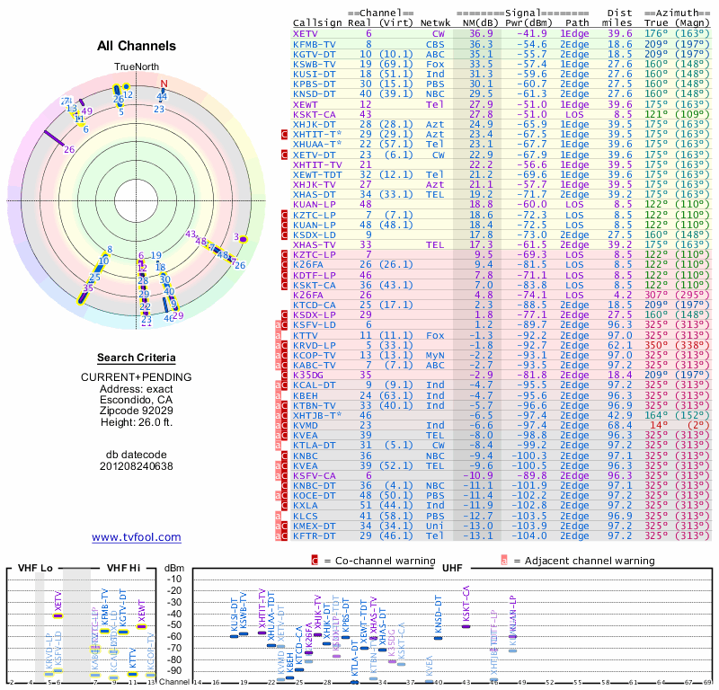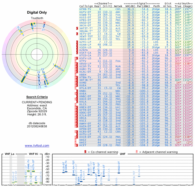 Here are the results for your location. The transmitter database was last updated on June 7, 2013. For more information about these plots and how to interpret them, please check out the Signal Analysis FAQ.
