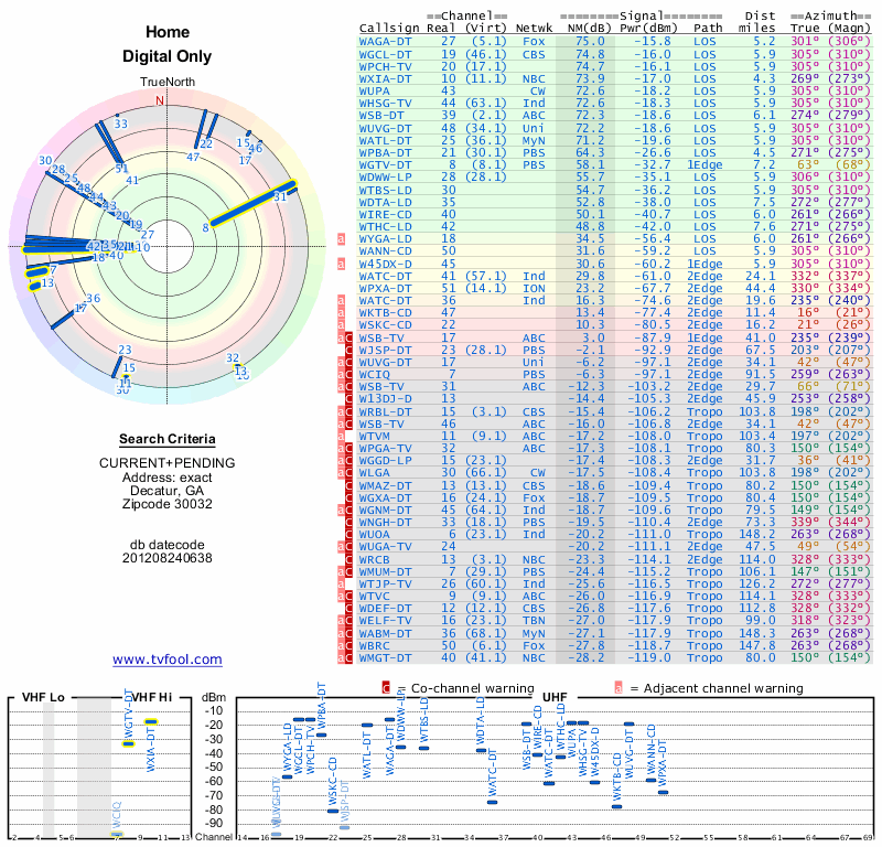 Here are the results for your location. The transmitter database was last updated on June 7, 2013. For more information about these plots and how to interpret them, please check out the Signal Analysis FAQ.