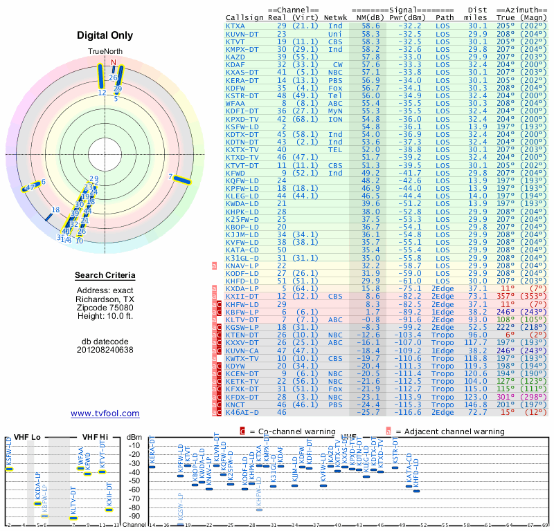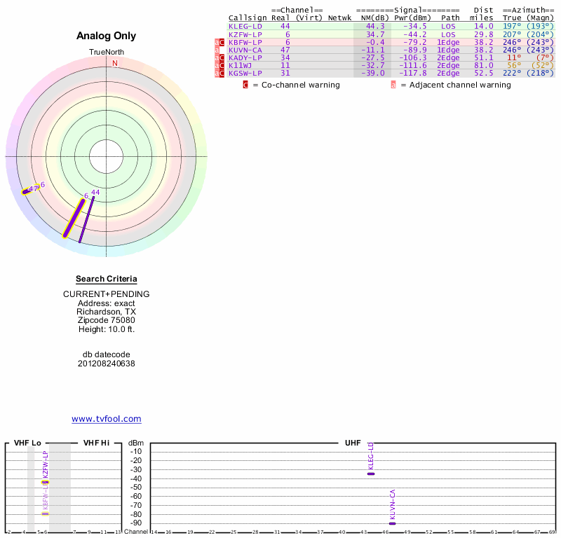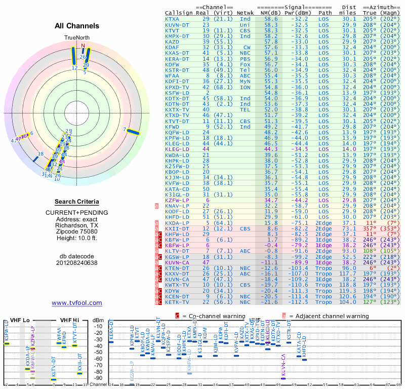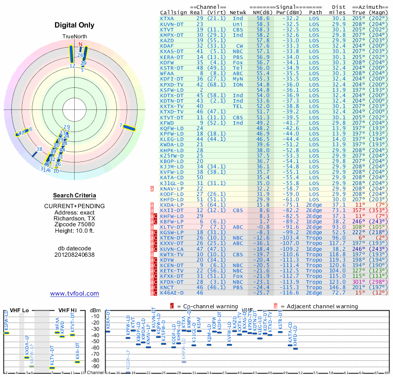 Here are the results for your location. The transmitter database was last updated on June 7, 2013. For more information about these plots and how to interpret them, please check out the Signal Analysis FAQ.