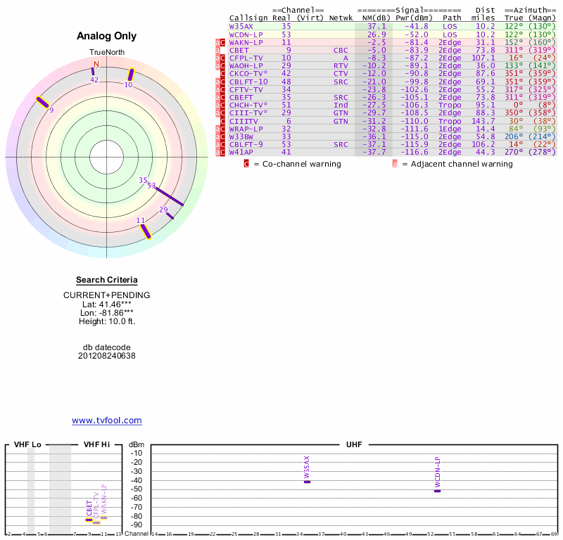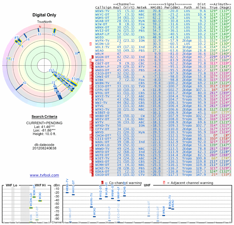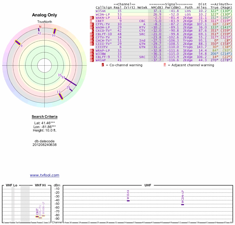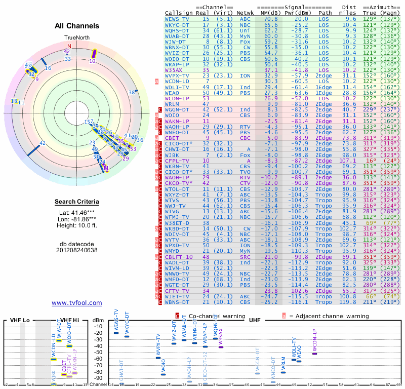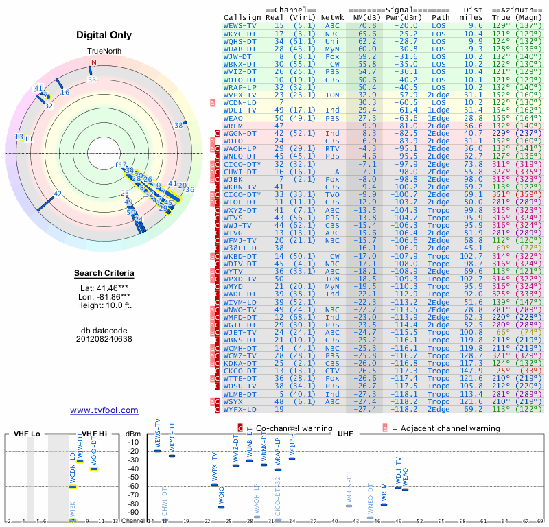 Here are the results for your location. The transmitter database was last updated on June 7, 2013. For more information about these plots and how to interpret them, please check out the Signal Analysis FAQ.