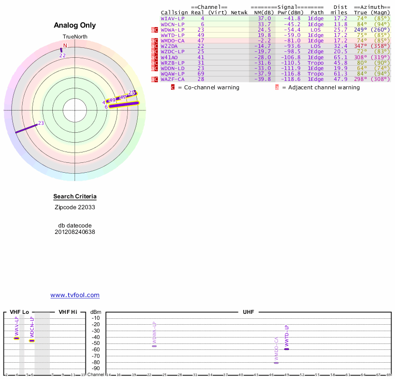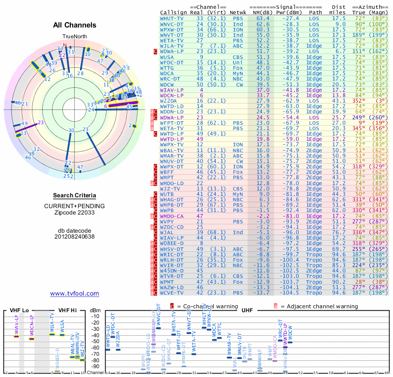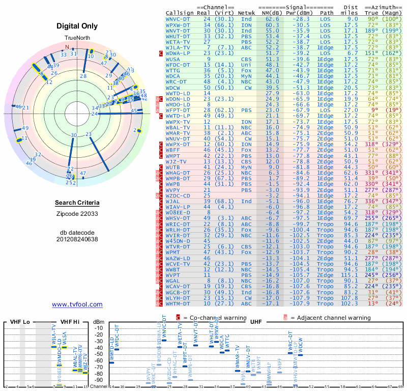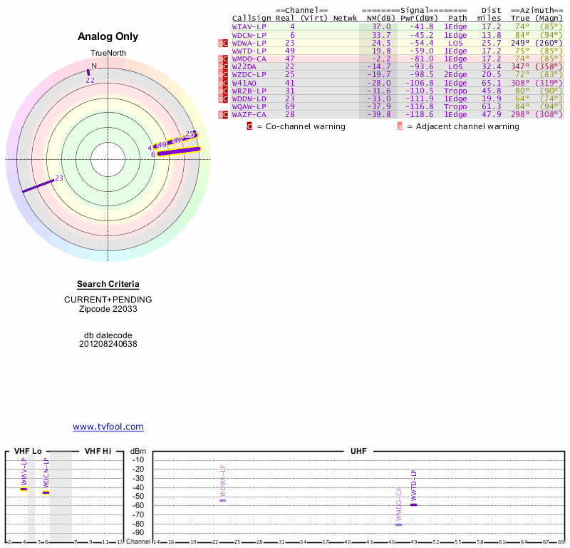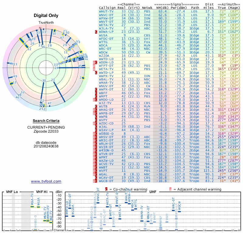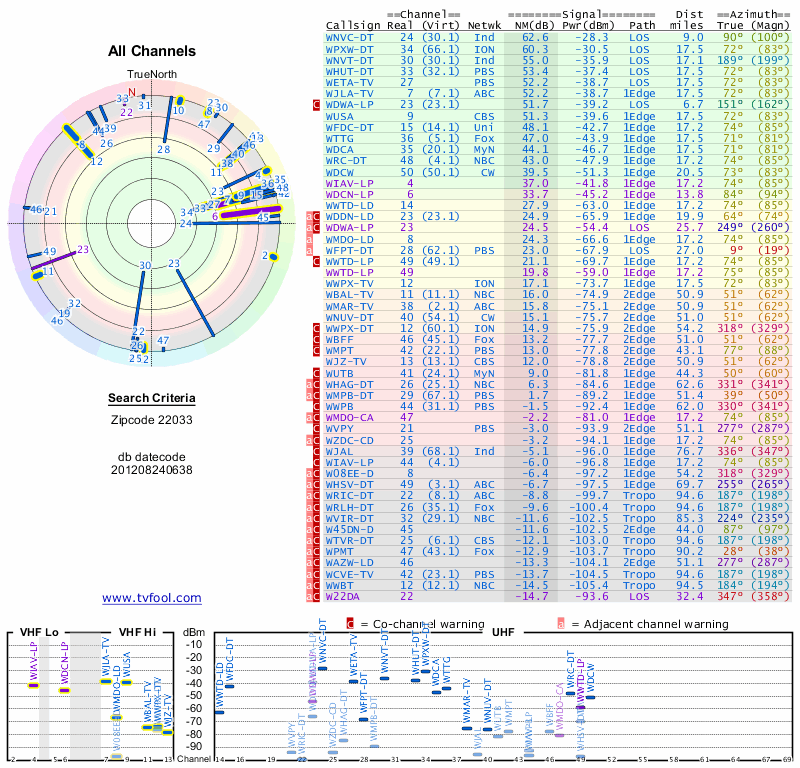 Here are the results for your location. The transmitter database was last updated on June 7, 2013. For more information about these plots and how to interpret them, please check out the Signal Analysis FAQ.