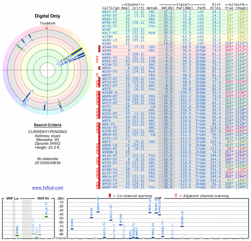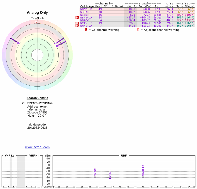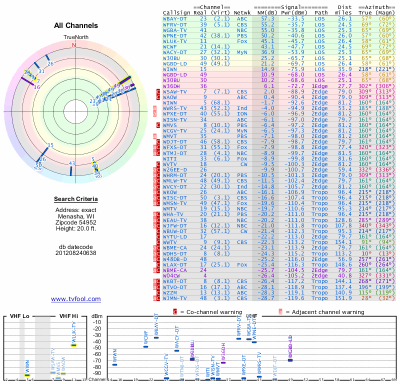 Here are the results for your location. The transmitter database was last updated on June 7, 2013. For more information about these plots and how to interpret them, please check out the Signal Analysis FAQ.