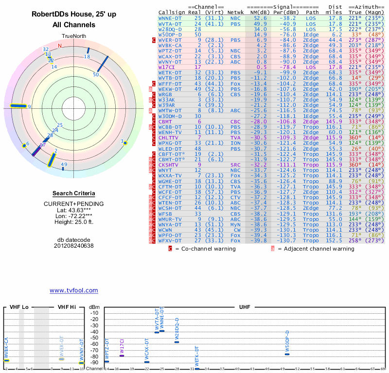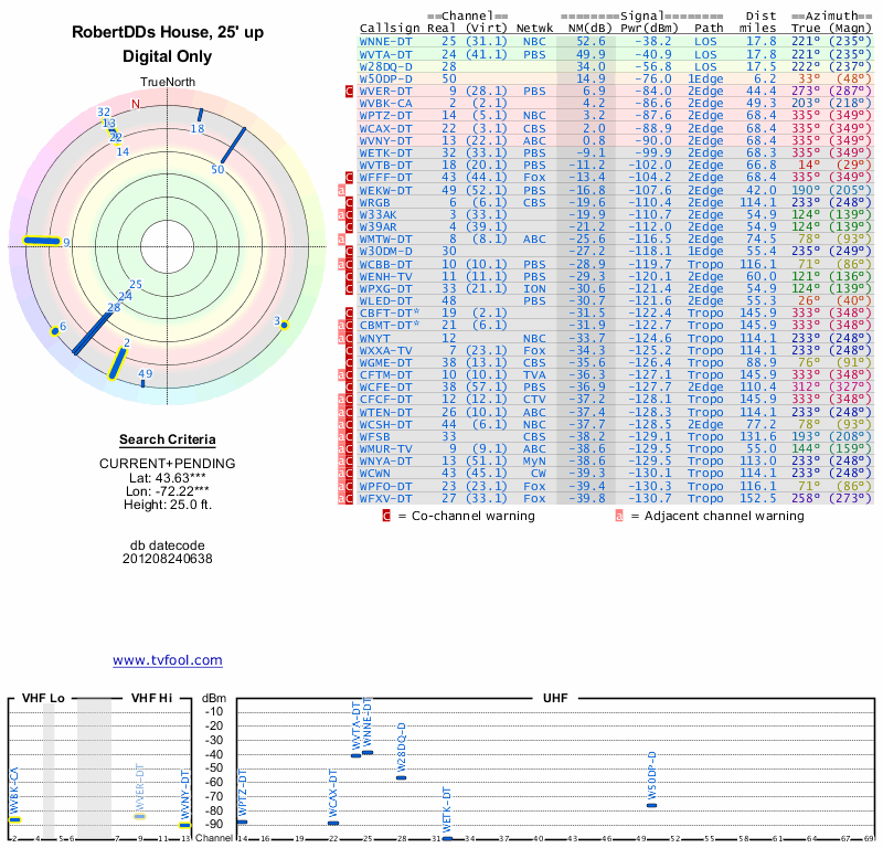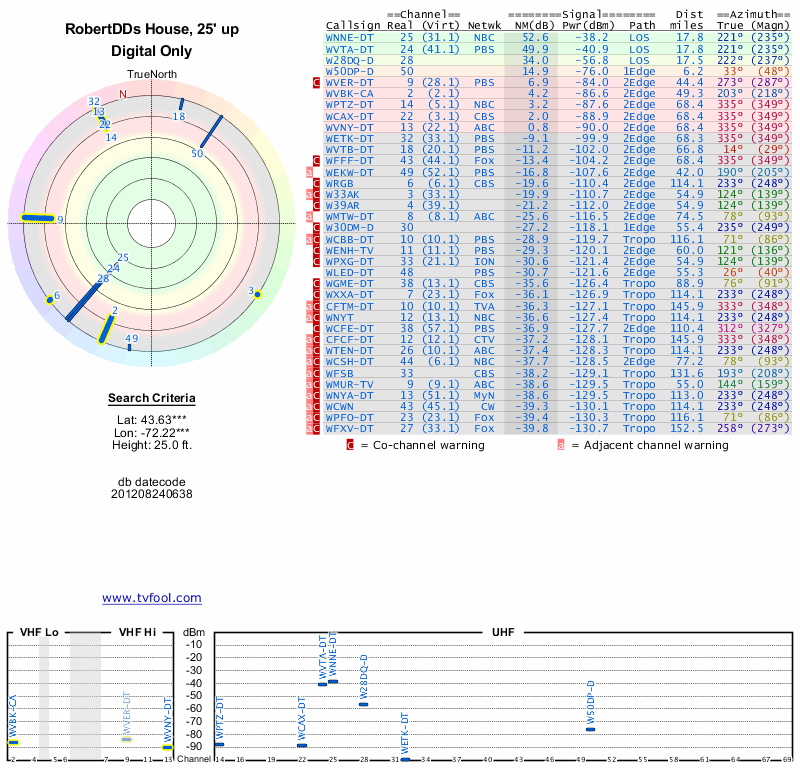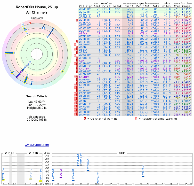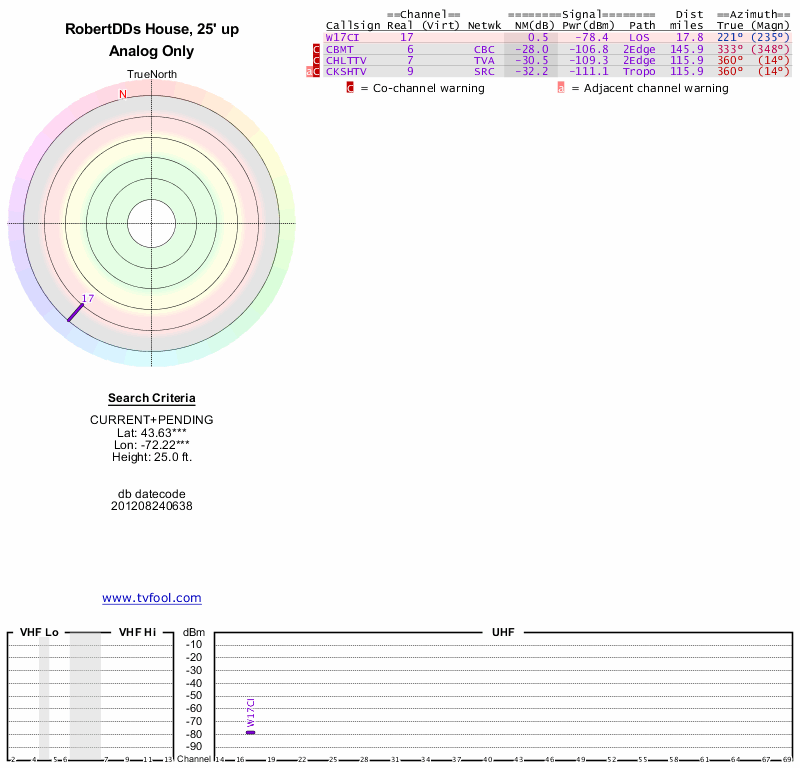 Here are the results for your location. The transmitter database was last updated on June 7, 2013. For more information about these plots and how to interpret them, please check out the Signal Analysis FAQ.