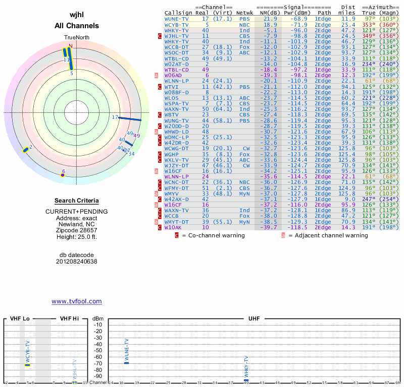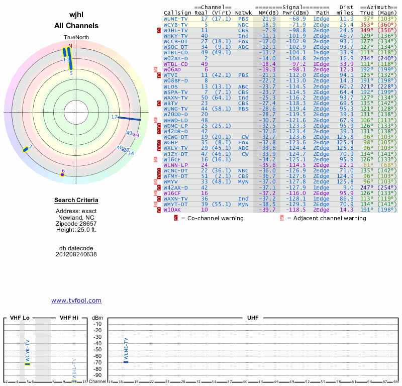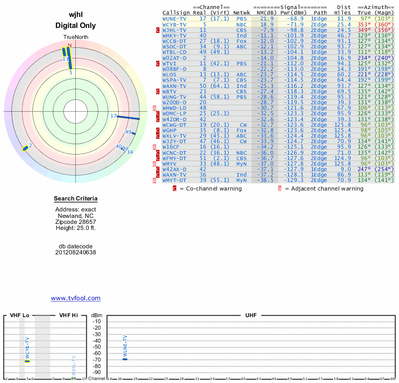 Here are the results for your location. The transmitter database was last updated on June 7, 2013. For more information about these plots and how to interpret them, please check out the Signal Analysis FAQ.