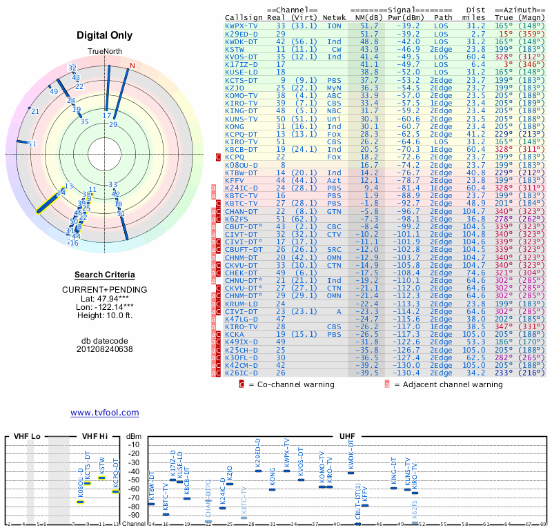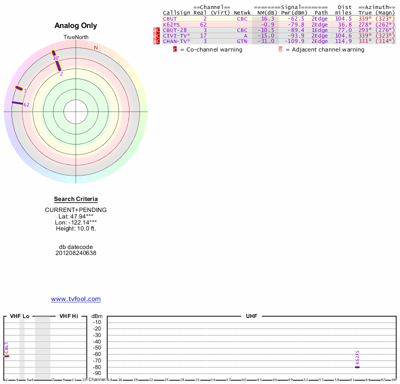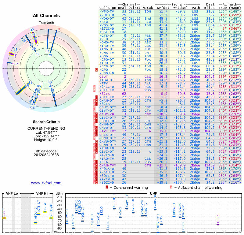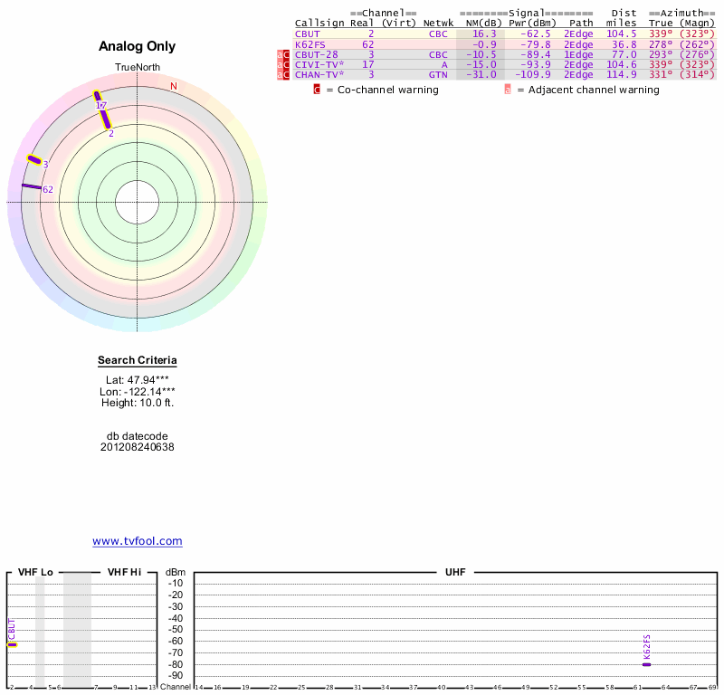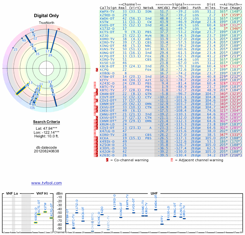 Here are the results for your location. The transmitter database was last updated on June 7, 2013. For more information about these plots and how to interpret them, please check out the Signal Analysis FAQ.