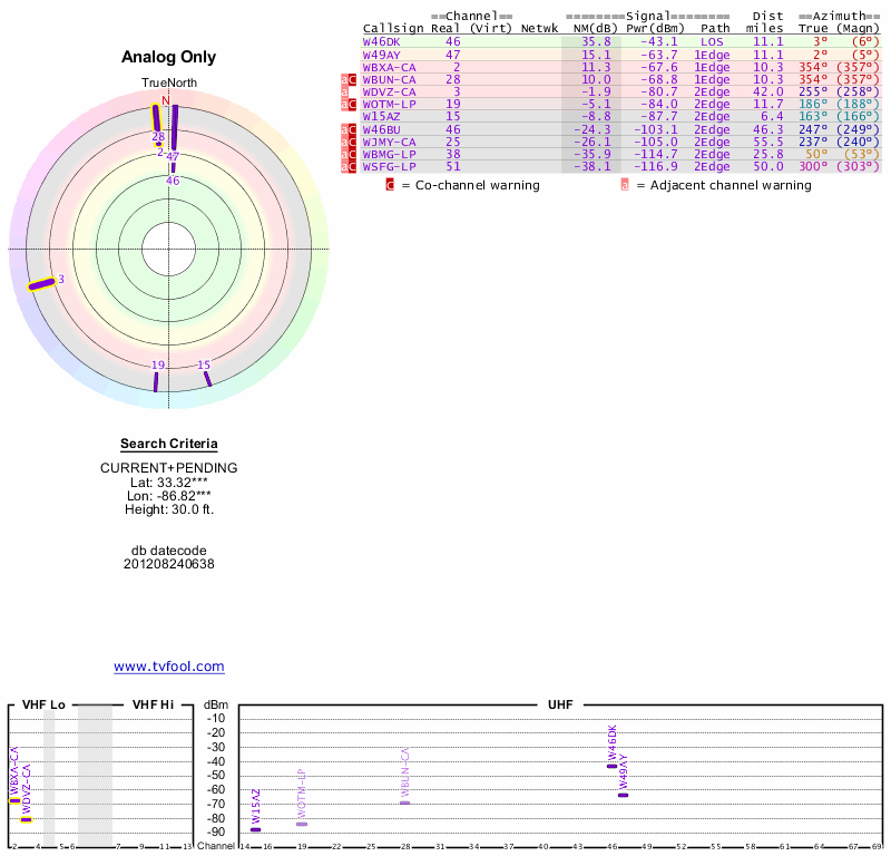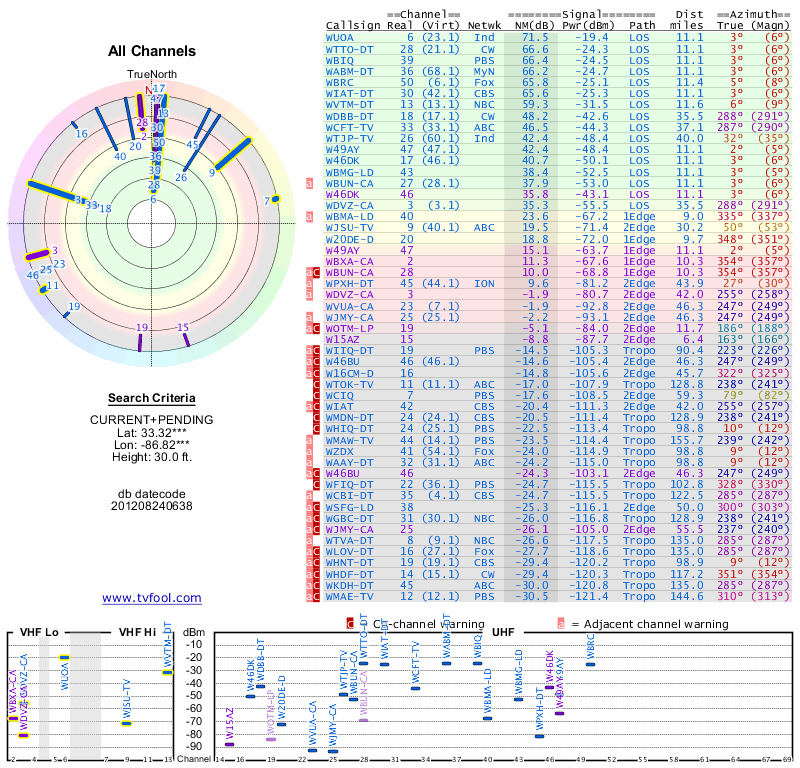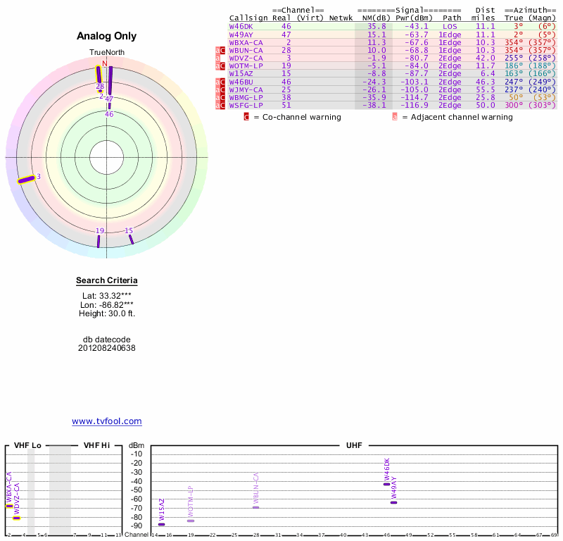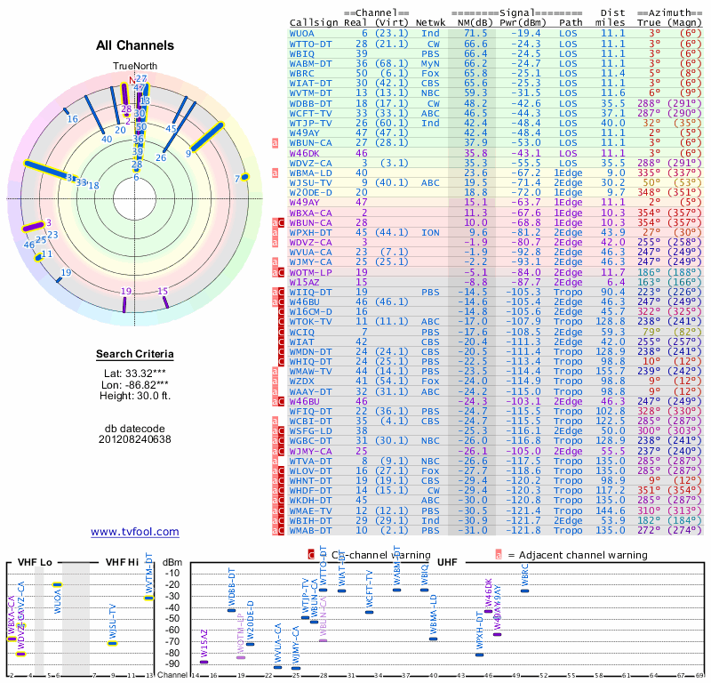 Here are the results for your location. The transmitter database was last updated on June 7, 2013. For more information about these plots and how to interpret them, please check out the Signal Analysis FAQ.