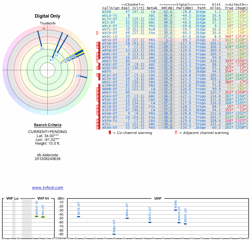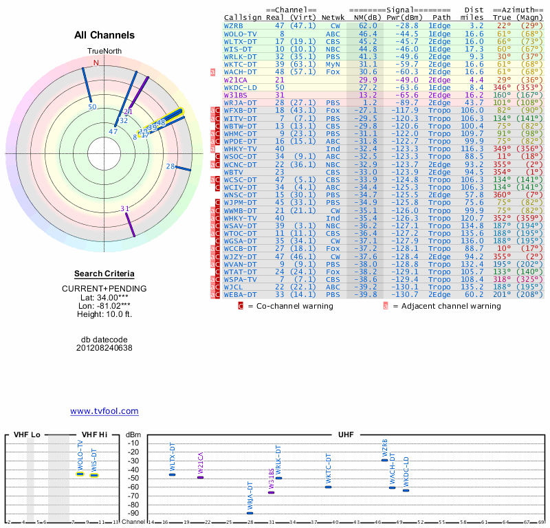 Here are the results for your location. The transmitter database was last updated on June 7, 2013. For more information about these plots and how to interpret them, please check out the Signal Analysis FAQ.