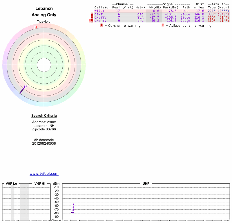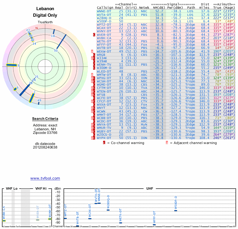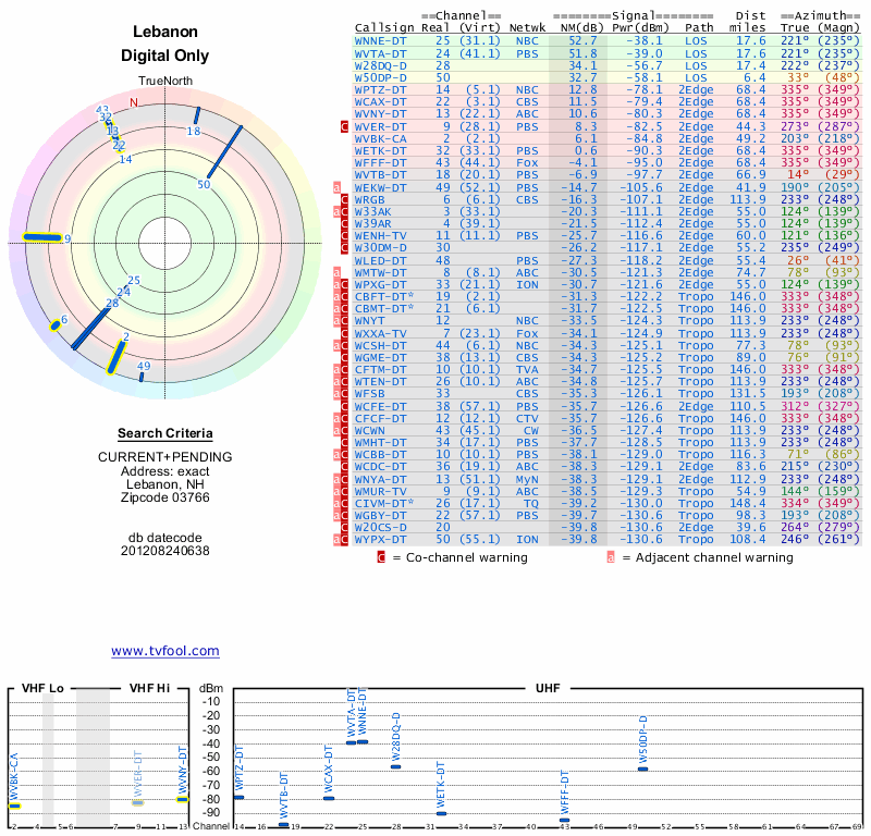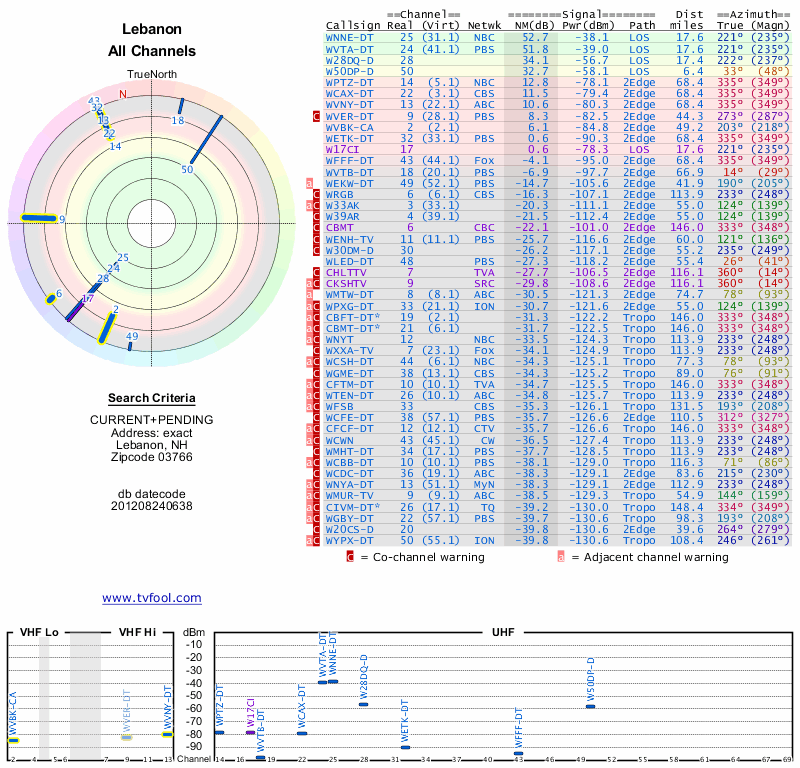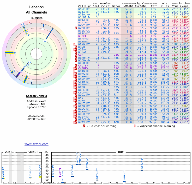 Here are the results for your location. The transmitter database was last updated on June 7, 2013. For more information about these plots and how to interpret them, please check out the Signal Analysis FAQ.