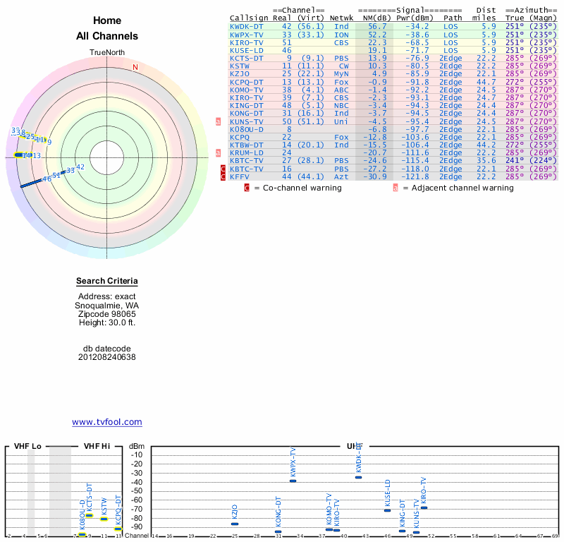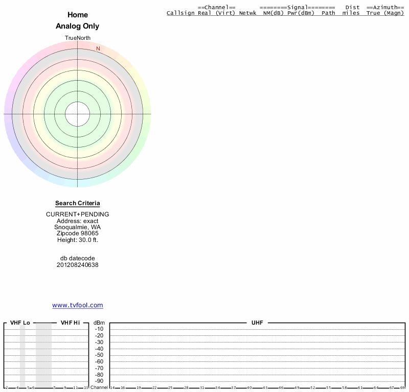 Here are the results for your location. The transmitter database was last updated on June 7, 2013. For more information about these plots and how to interpret them, please check out the Signal Analysis FAQ.