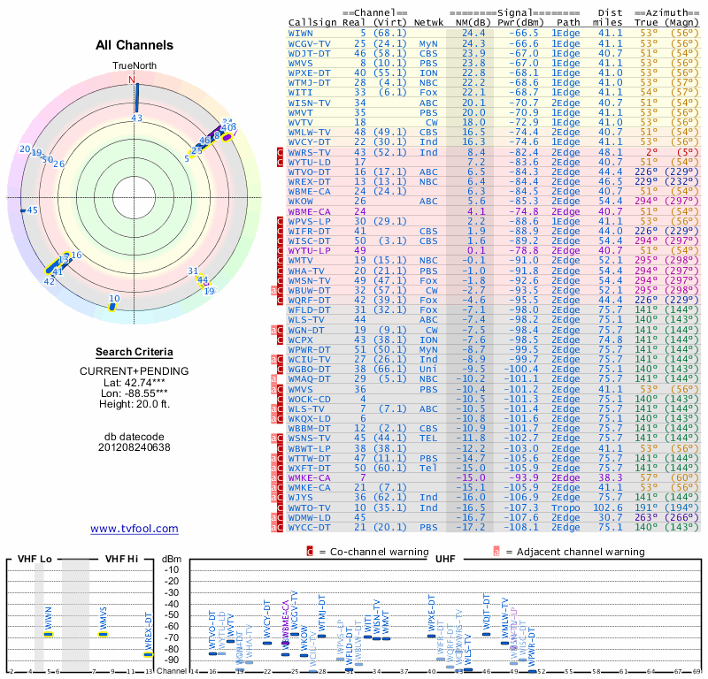 Here are the results for your location. The transmitter database was last updated on June 7, 2013. For more information about these plots and how to interpret them, please check out the Signal Analysis FAQ.