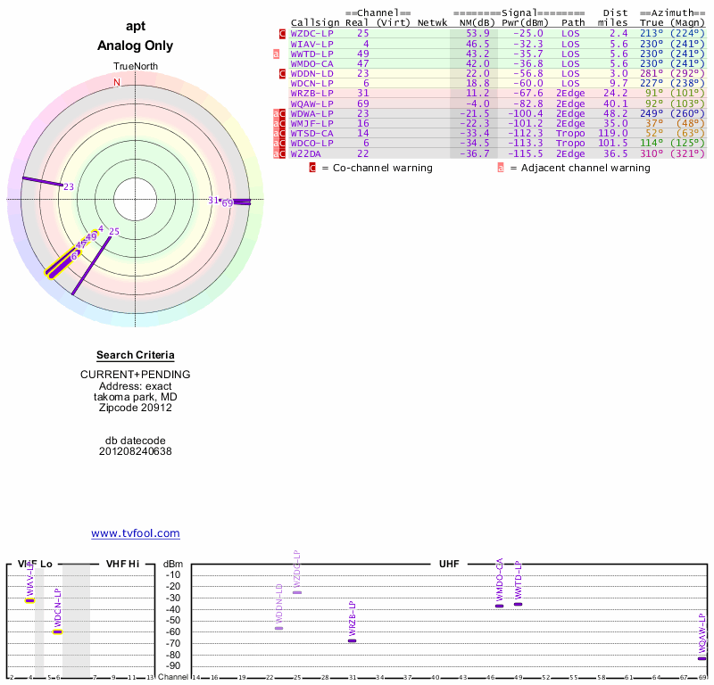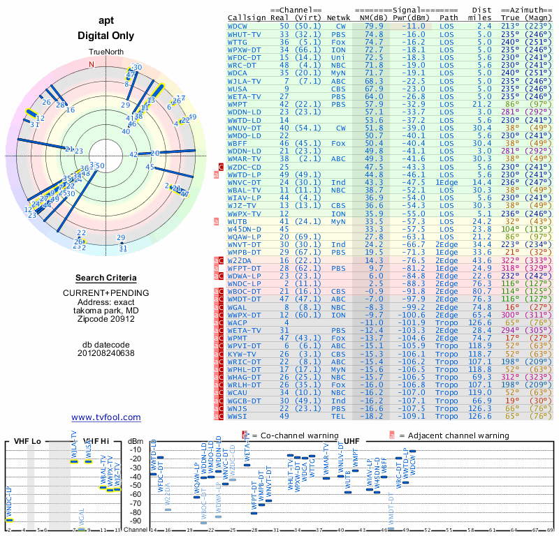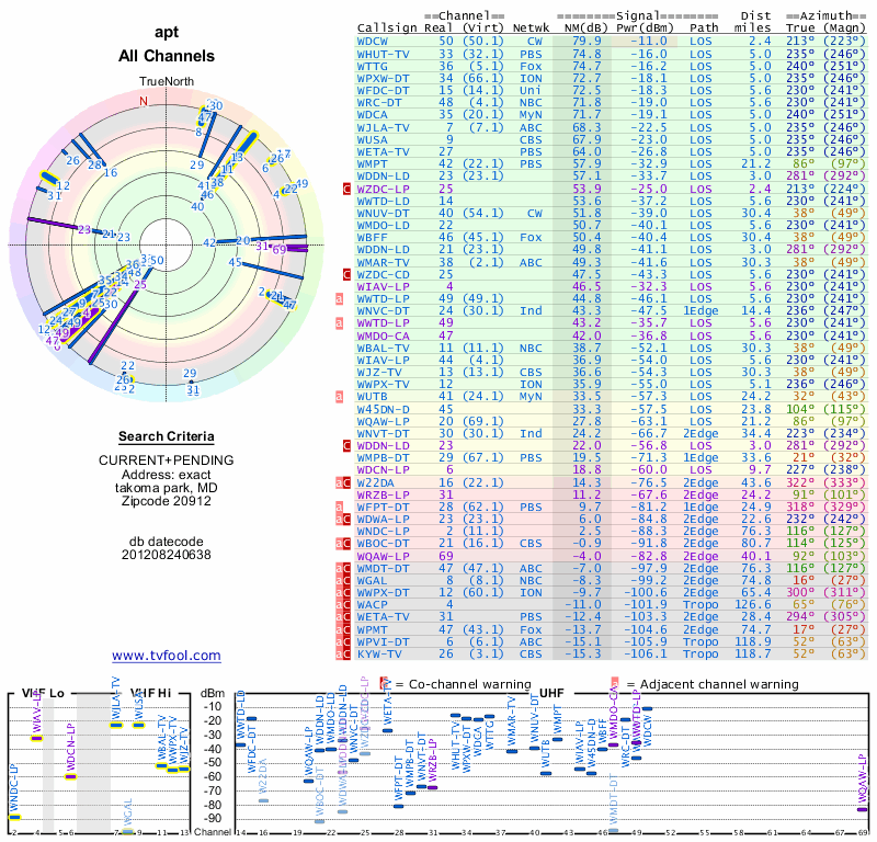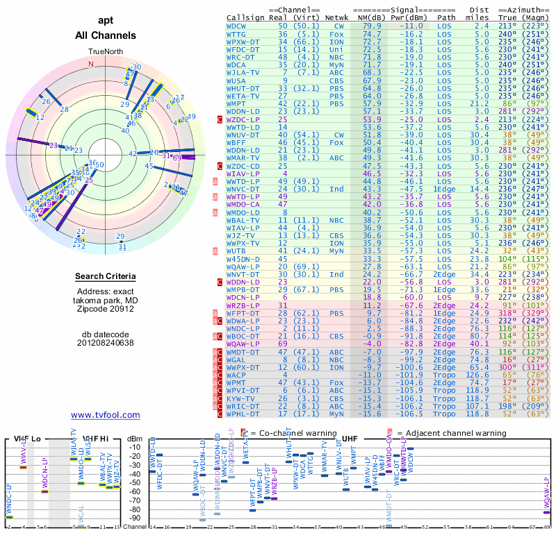 Here are the results for your location. The transmitter database was last updated on June 7, 2013. For more information about these plots and how to interpret them, please check out the Signal Analysis FAQ.