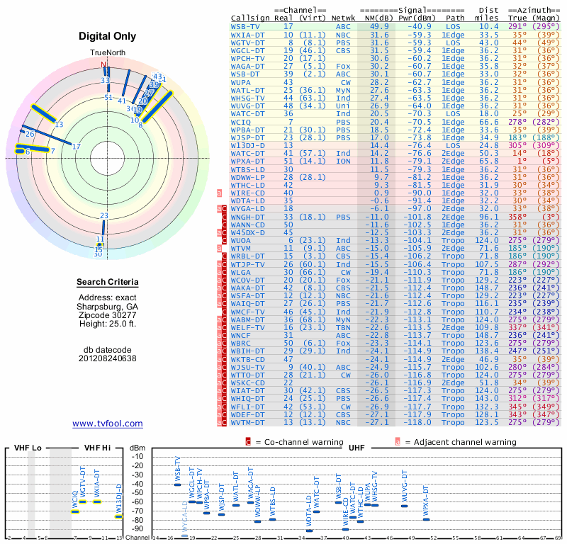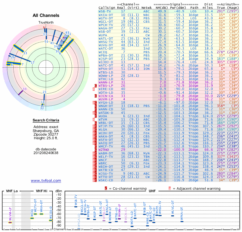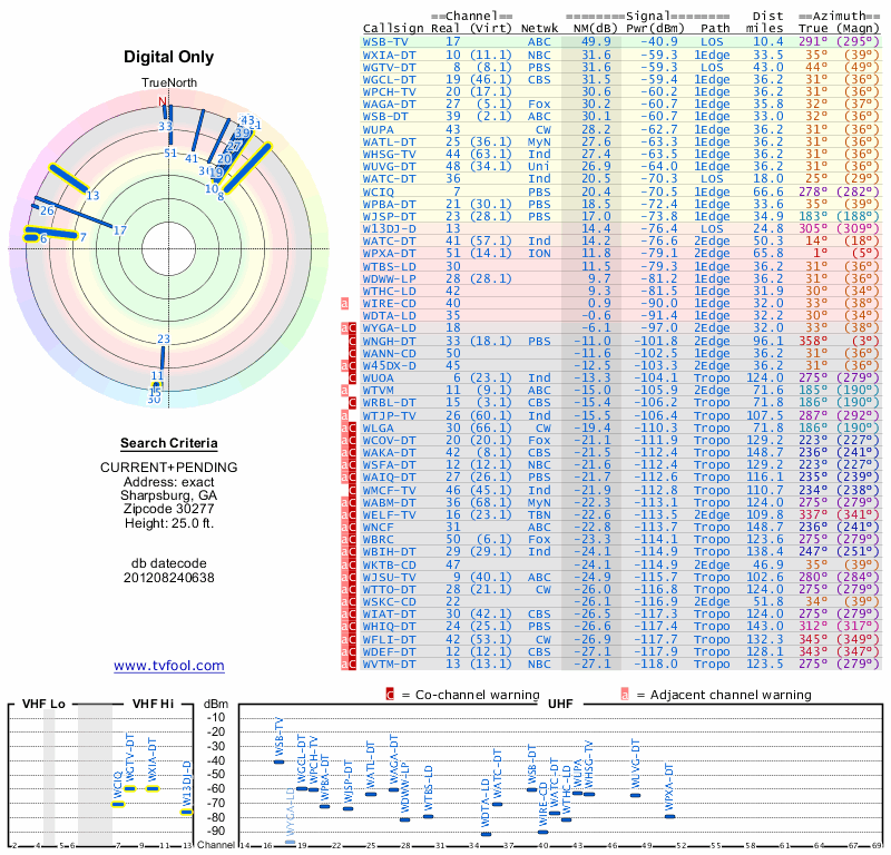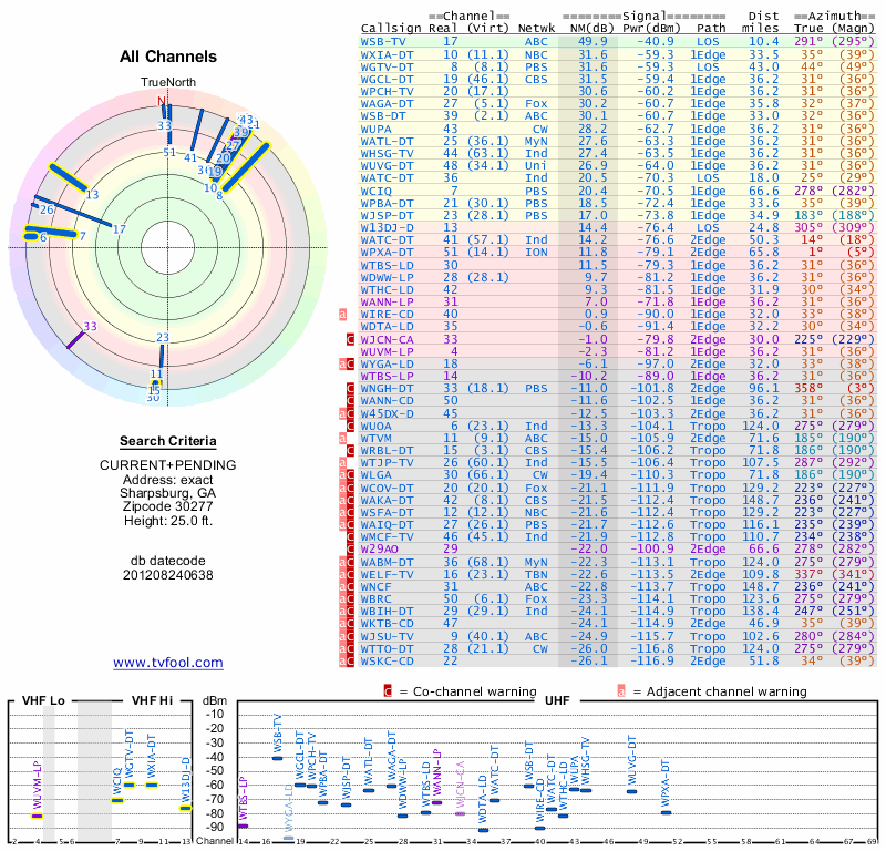 Here are the results for your location. The transmitter database was last updated on June 7, 2013. For more information about these plots and how to interpret them, please check out the Signal Analysis FAQ.