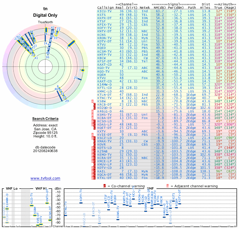 Here are the results for your location. The transmitter database was last updated on June 7, 2013. For more information about these plots and how to interpret them, please check out the Signal Analysis FAQ.