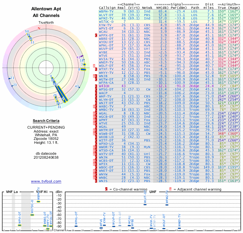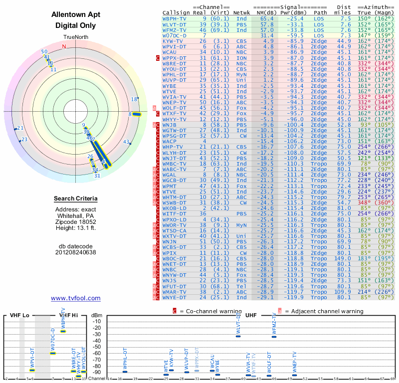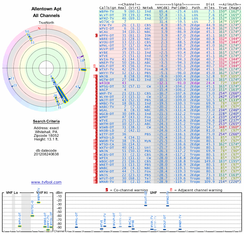 Here are the results for your location. The transmitter database was last updated on June 7, 2013. For more information about these plots and how to interpret them, please check out the Signal Analysis FAQ.