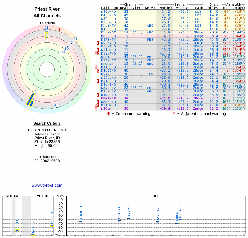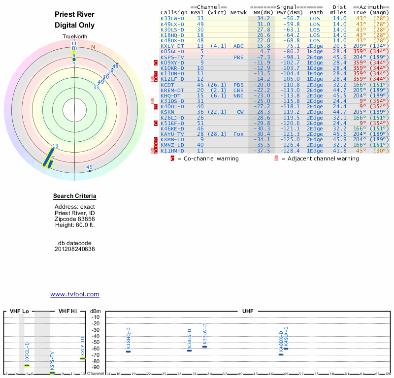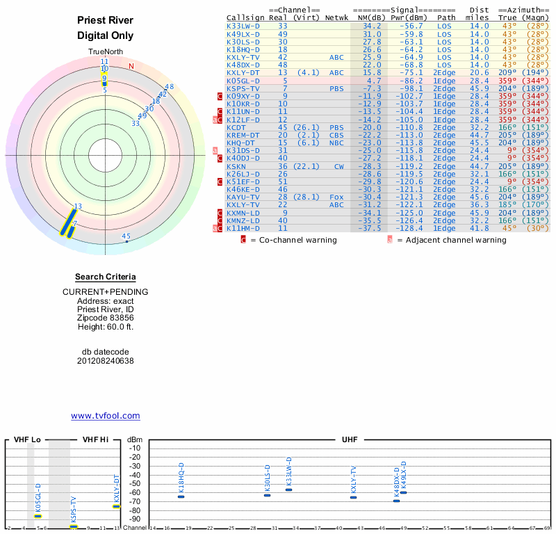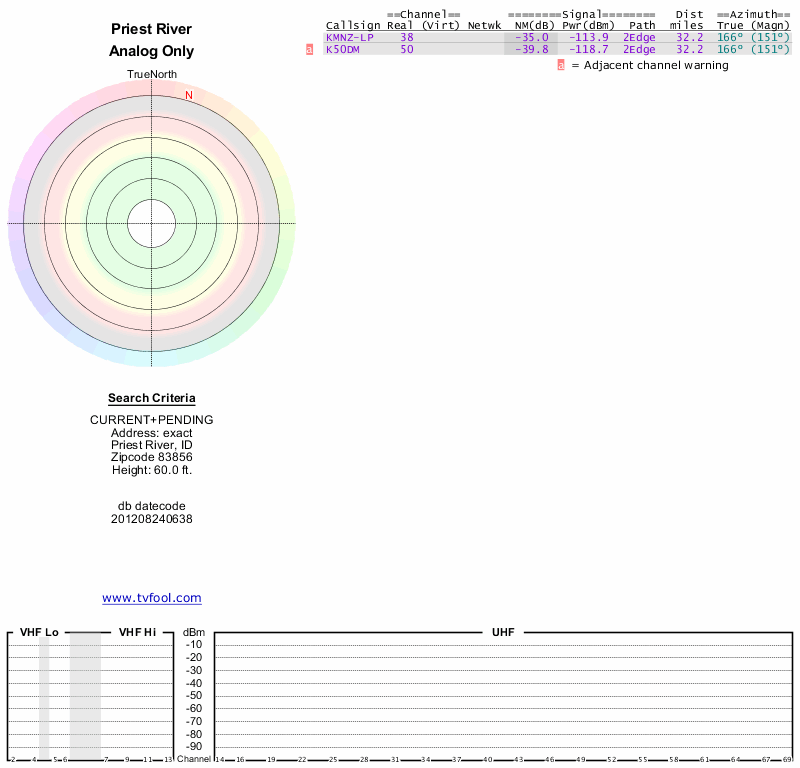 Here are the results for your location. The transmitter database was last updated on June 7, 2013. For more information about these plots and how to interpret them, please check out the Signal Analysis FAQ.