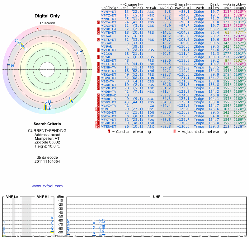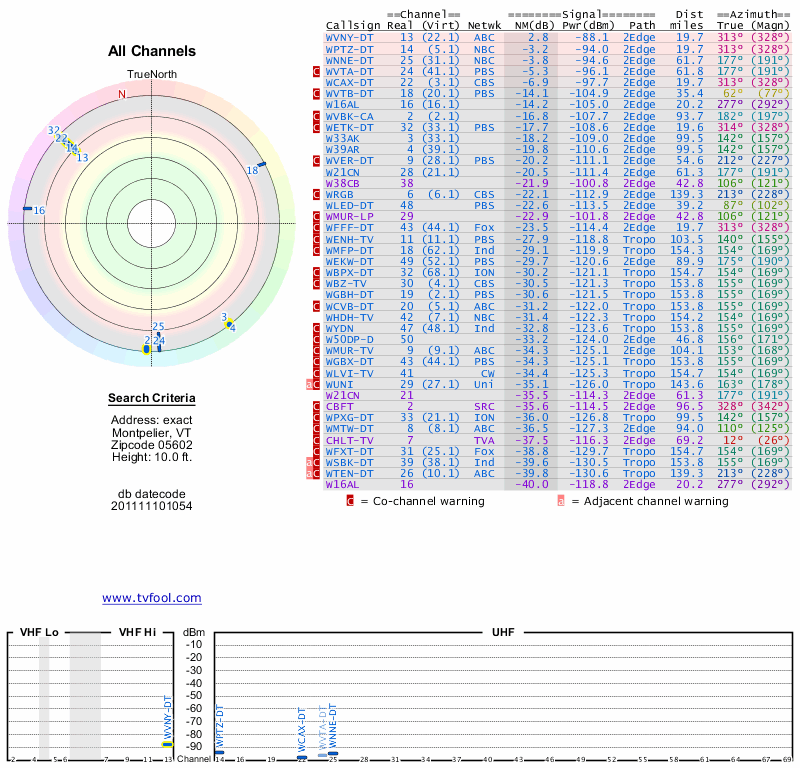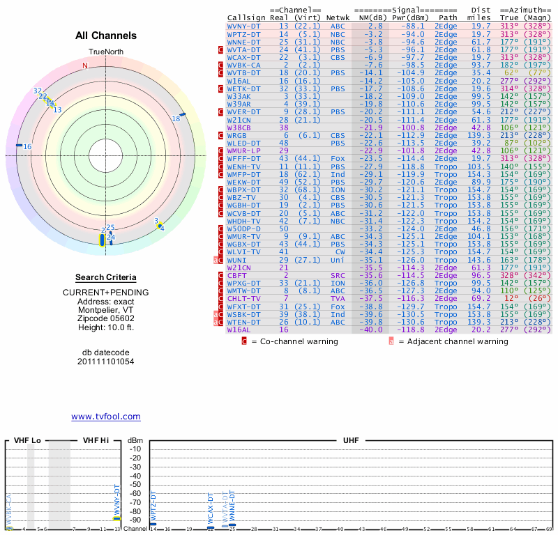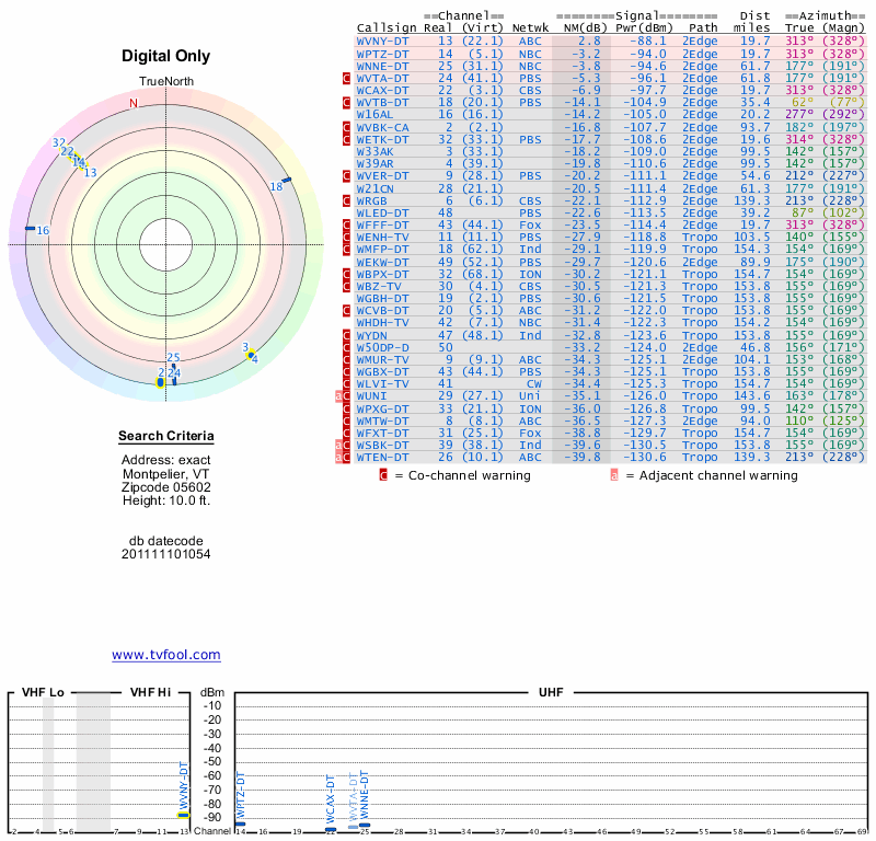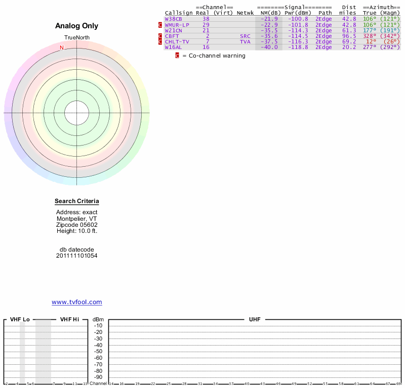 Here are the results for your location. The transmitter database was last updated on June 7, 2013. For more information about these plots and how to interpret them, please check out the Signal Analysis FAQ.
