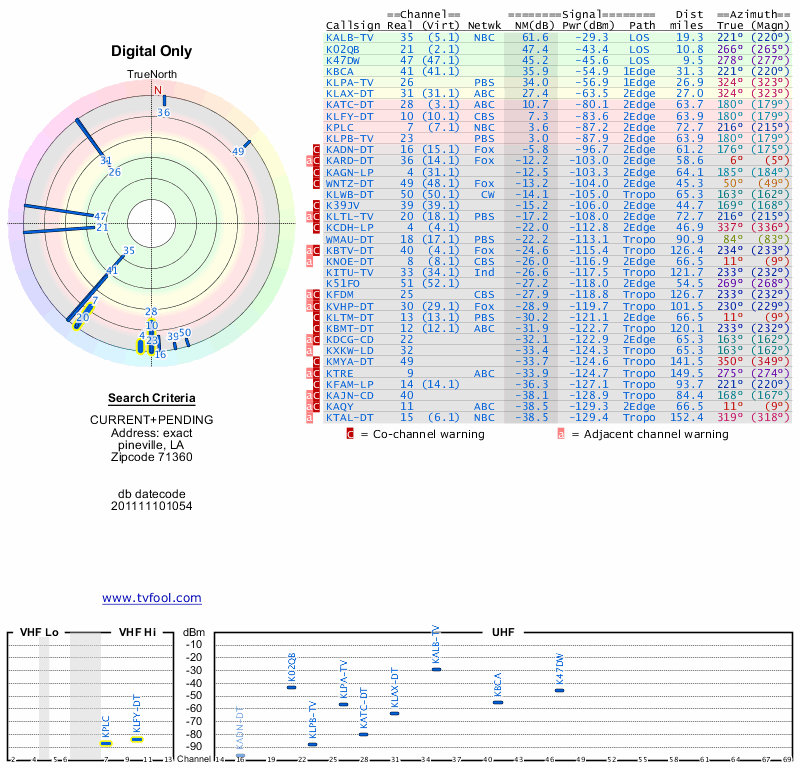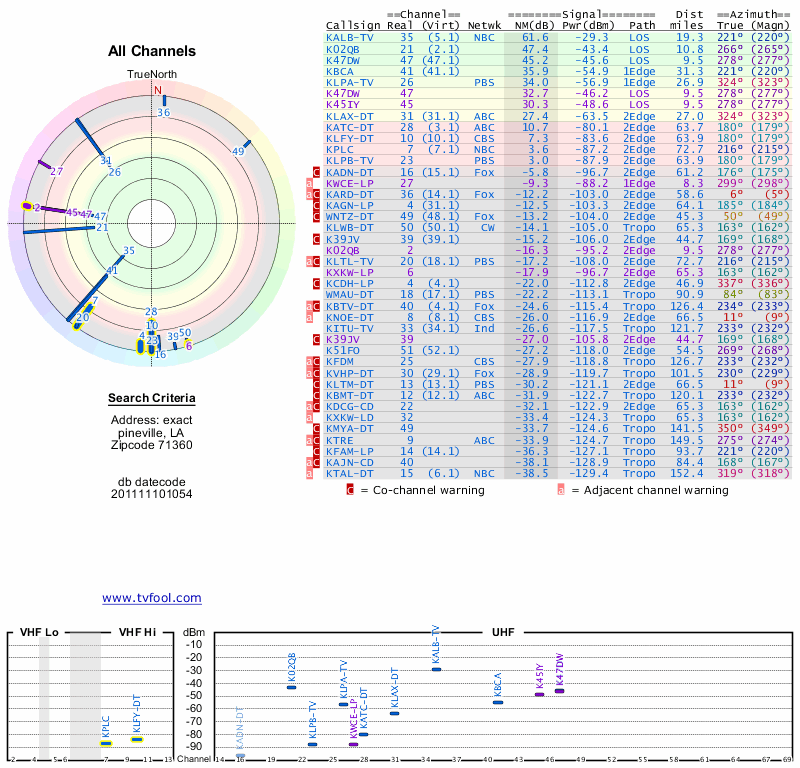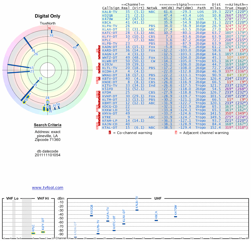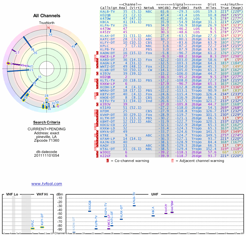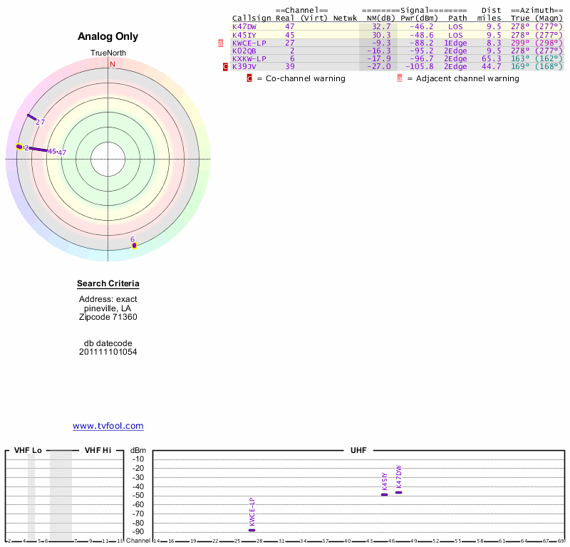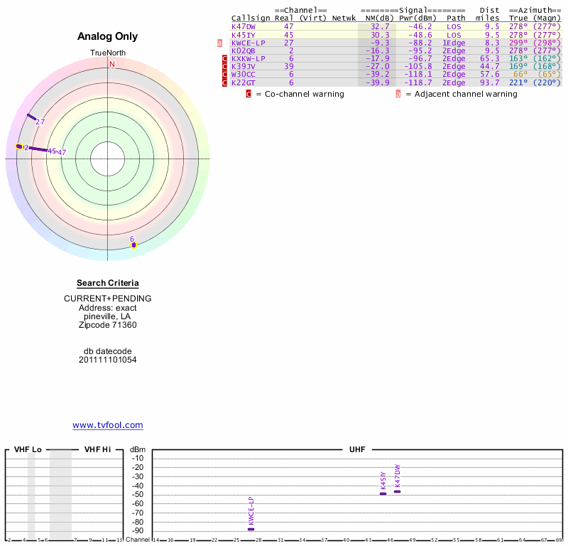 Here are the results for your location. The transmitter database was last updated on June 7, 2013. For more information about these plots and how to interpret them, please check out the Signal Analysis FAQ.