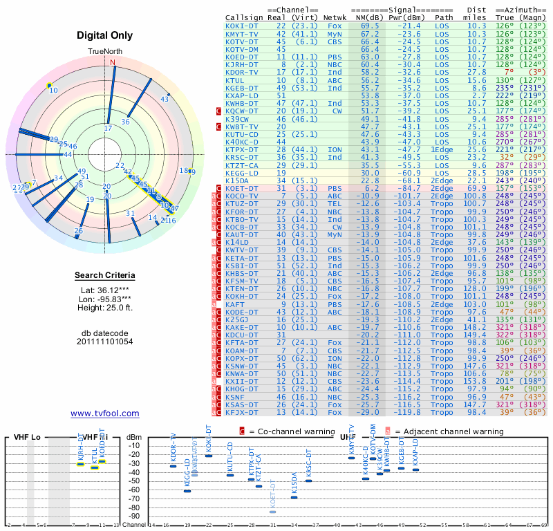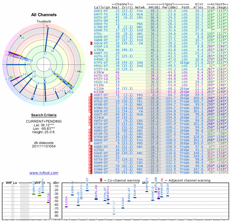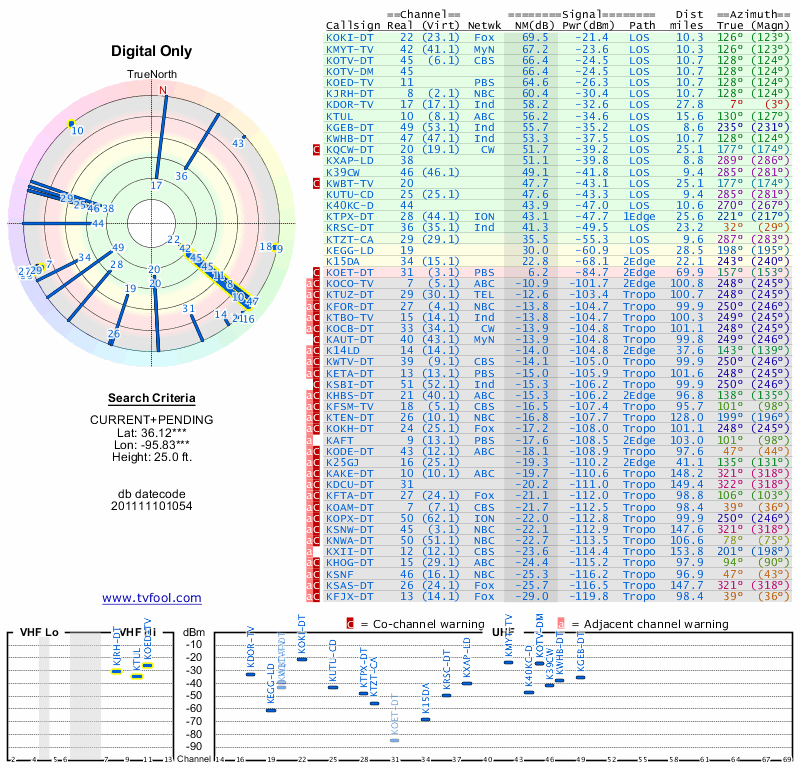 Here are the results for your location. The transmitter database was last updated on June 7, 2013. For more information about these plots and how to interpret them, please check out the Signal Analysis FAQ.
