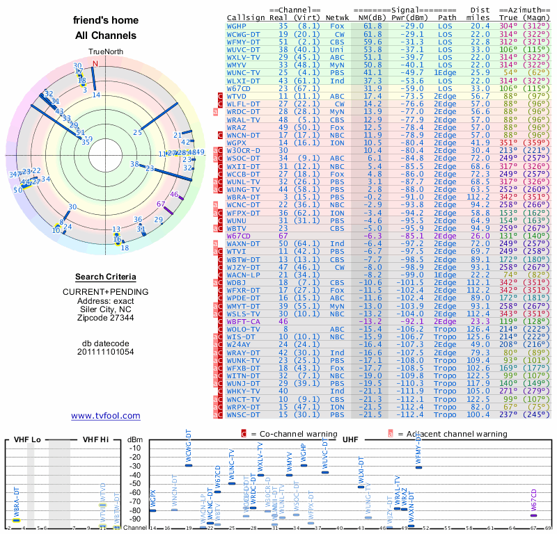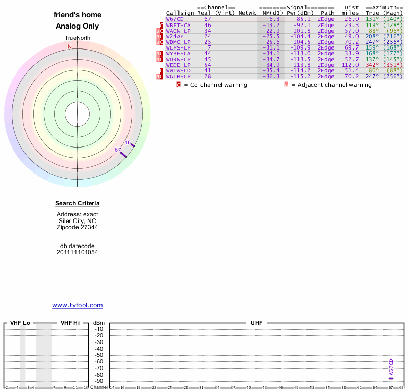Here are the results for your location. The transmitter database was last updated on June 7, 2013. For more information about these plots and how to interpret them, please check out the Signal Analysis FAQ.