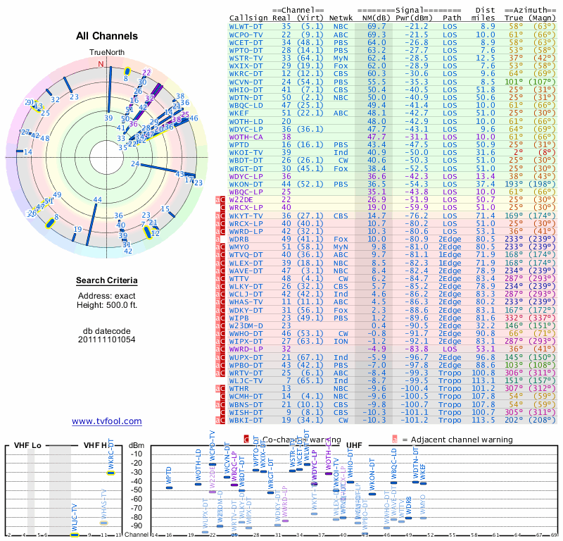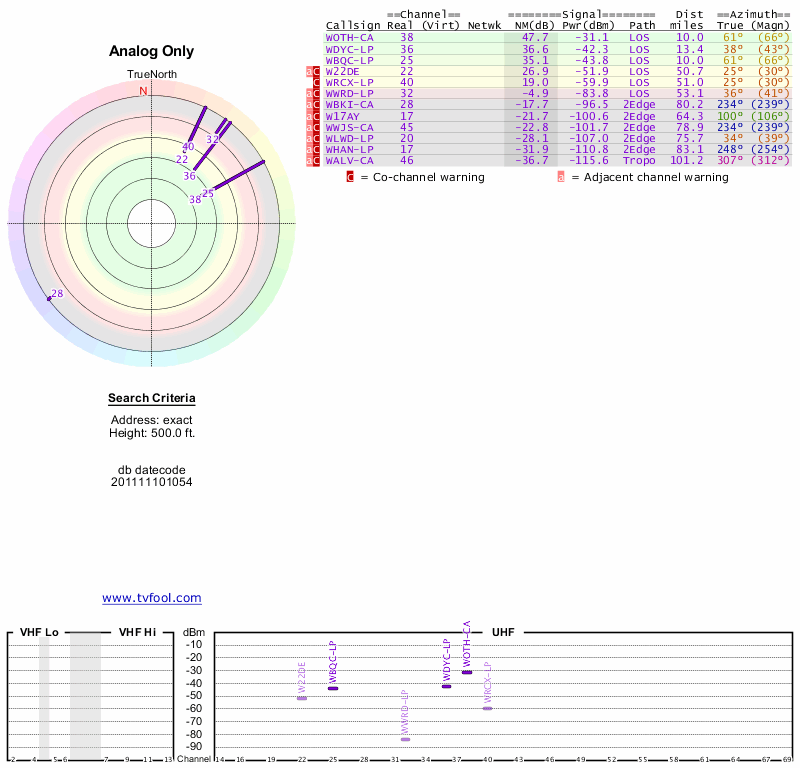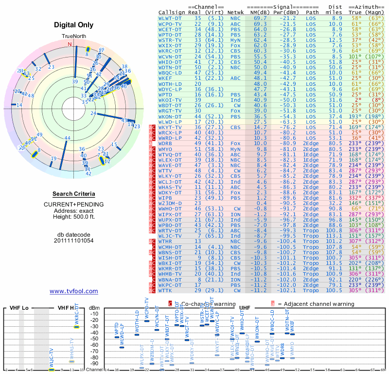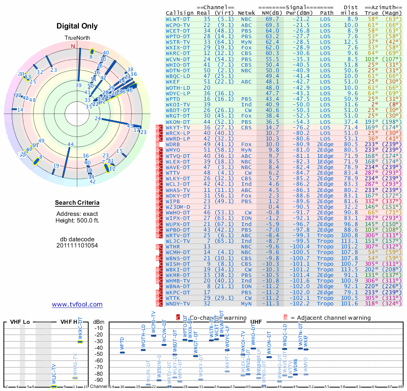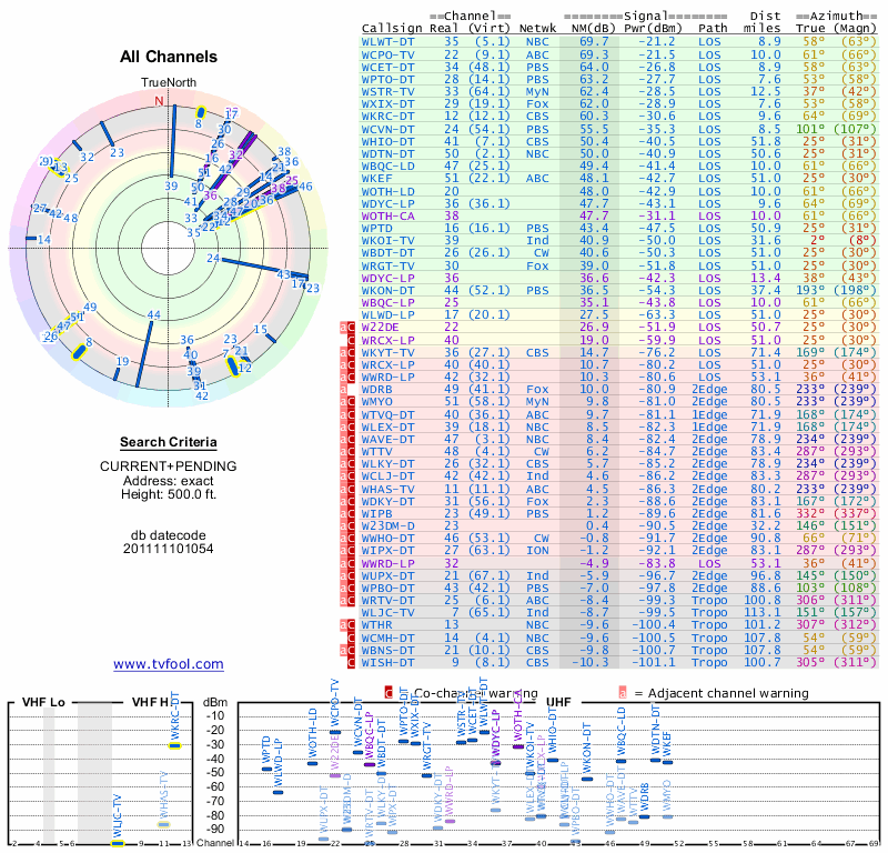 Here are the results for your location. The transmitter database was last updated on June 7, 2013. For more information about these plots and how to interpret them, please check out the Signal Analysis FAQ.