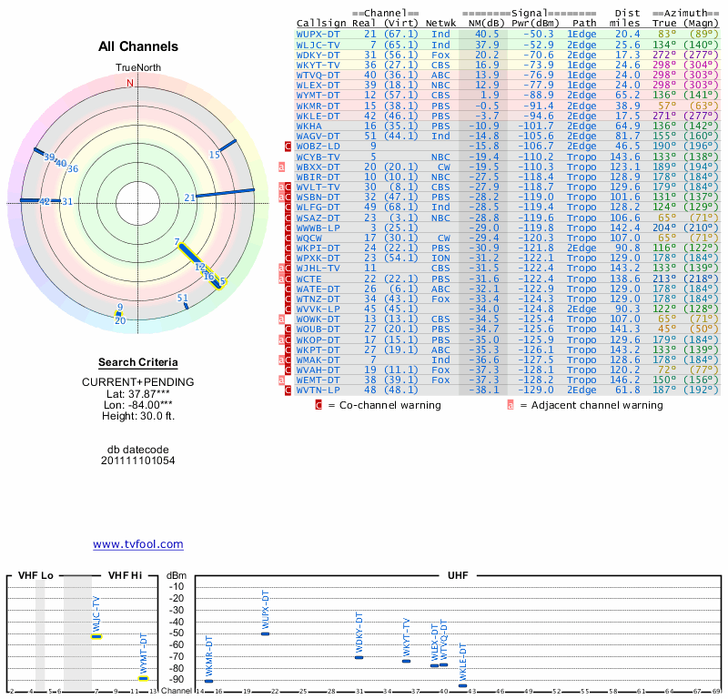 Here are the results for your location. The transmitter database was last updated on June 7, 2013. For more information about these plots and how to interpret them, please check out the Signal Analysis FAQ.